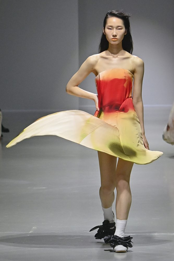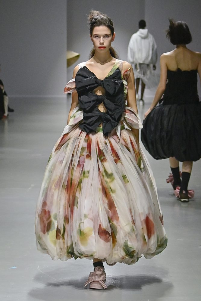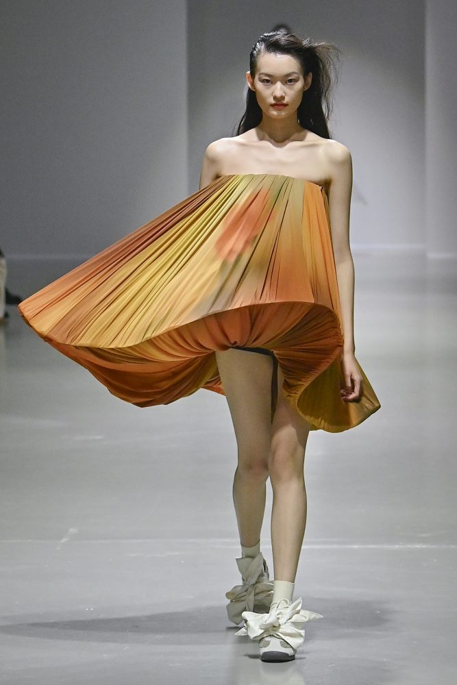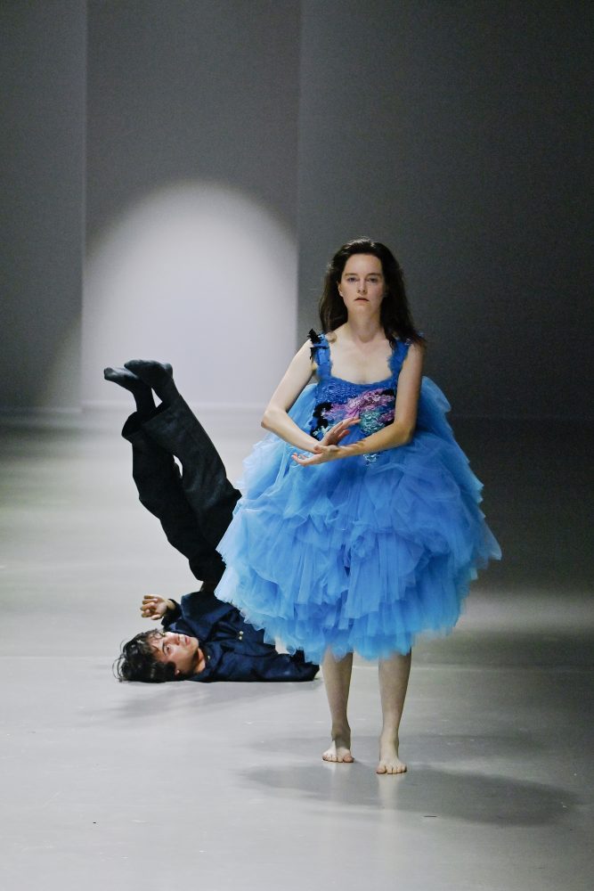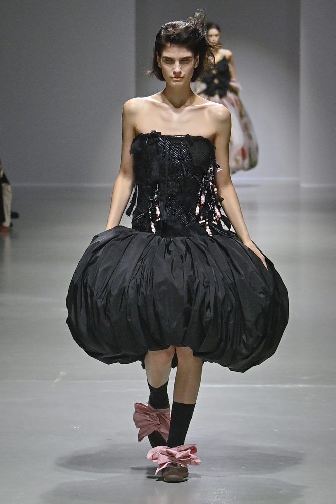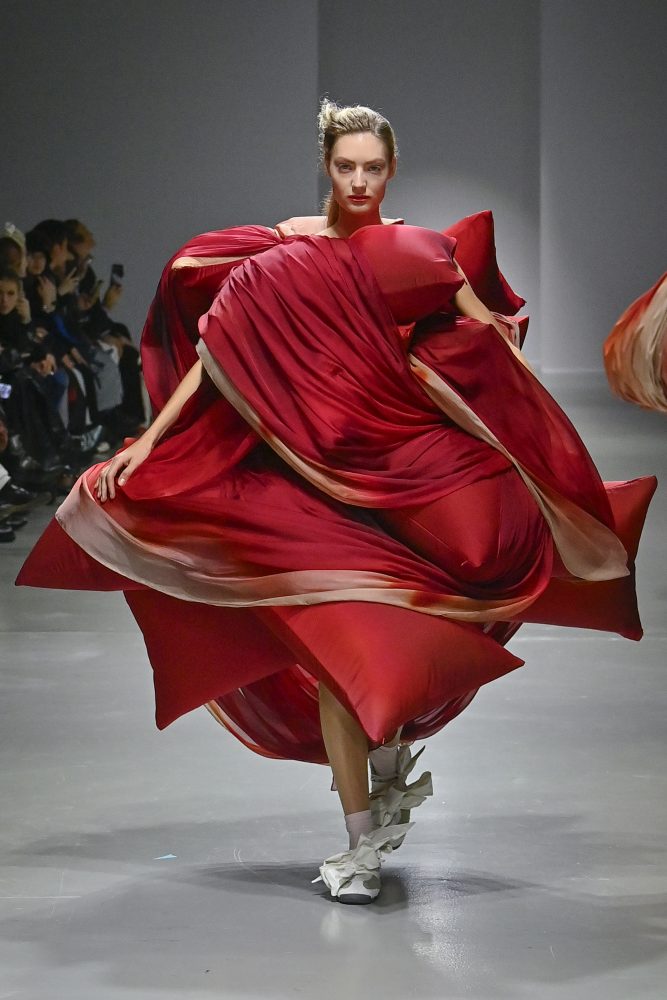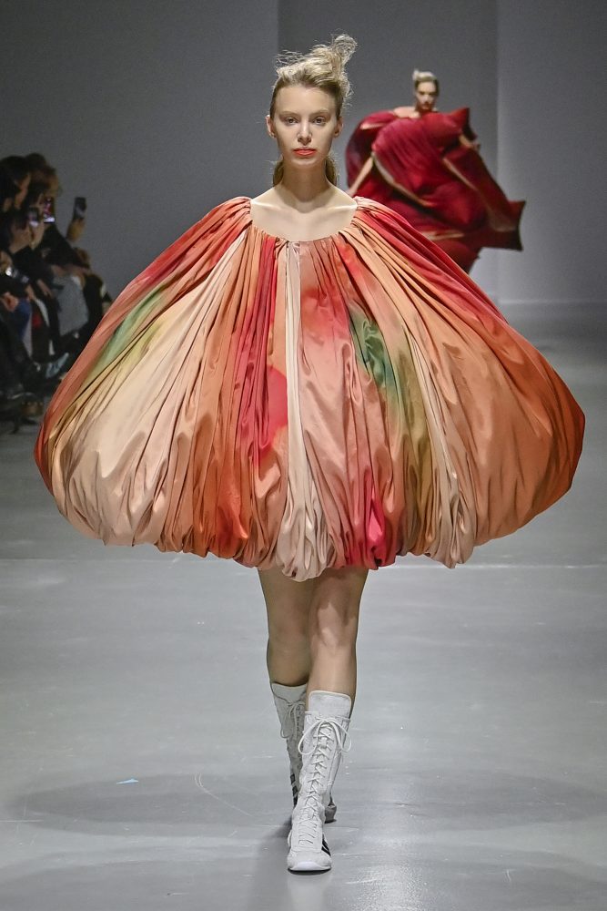 Hú, inspired by movement and volume, included a live performance by dancers Emma Portner and Léo Handtschoewercker. Many new silhouettes in the collection include the idea of freeze framing pieces in movement, shaped by using boning and wire at the hems of skirts and dresses or playful shapes of garments that look as if they have been tugged on one side by a door. Hú captured the romantic details of pieces in unintentional moments.