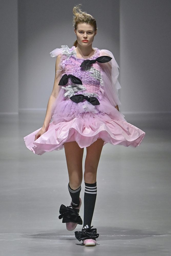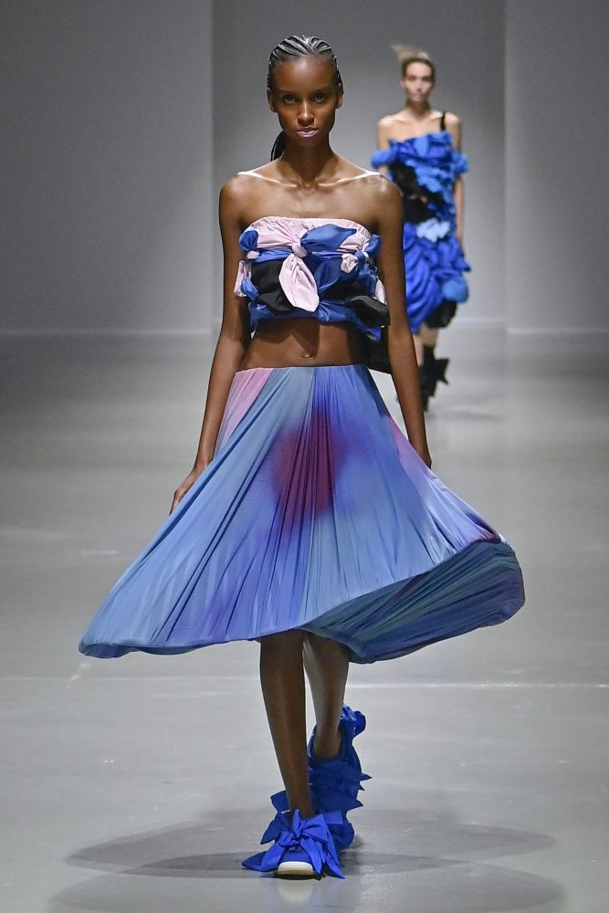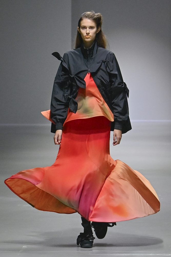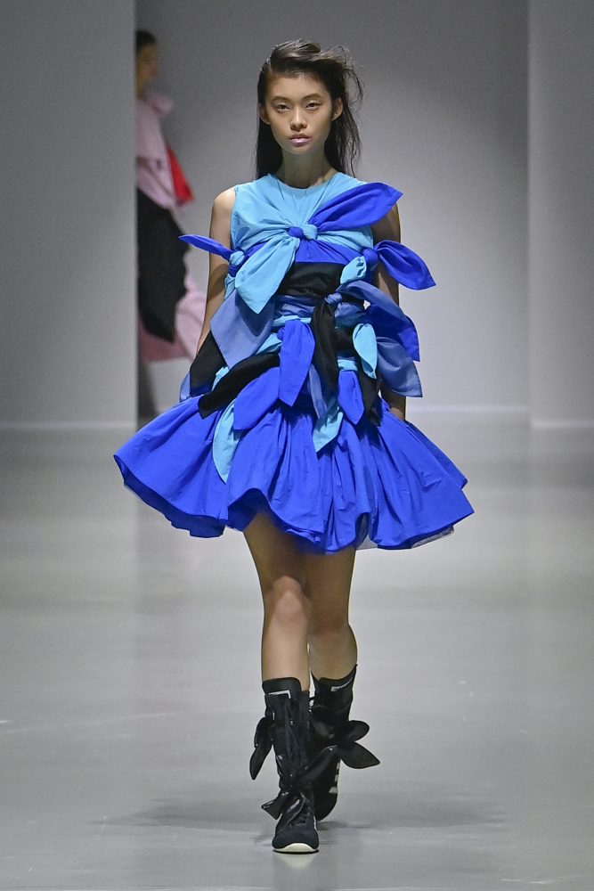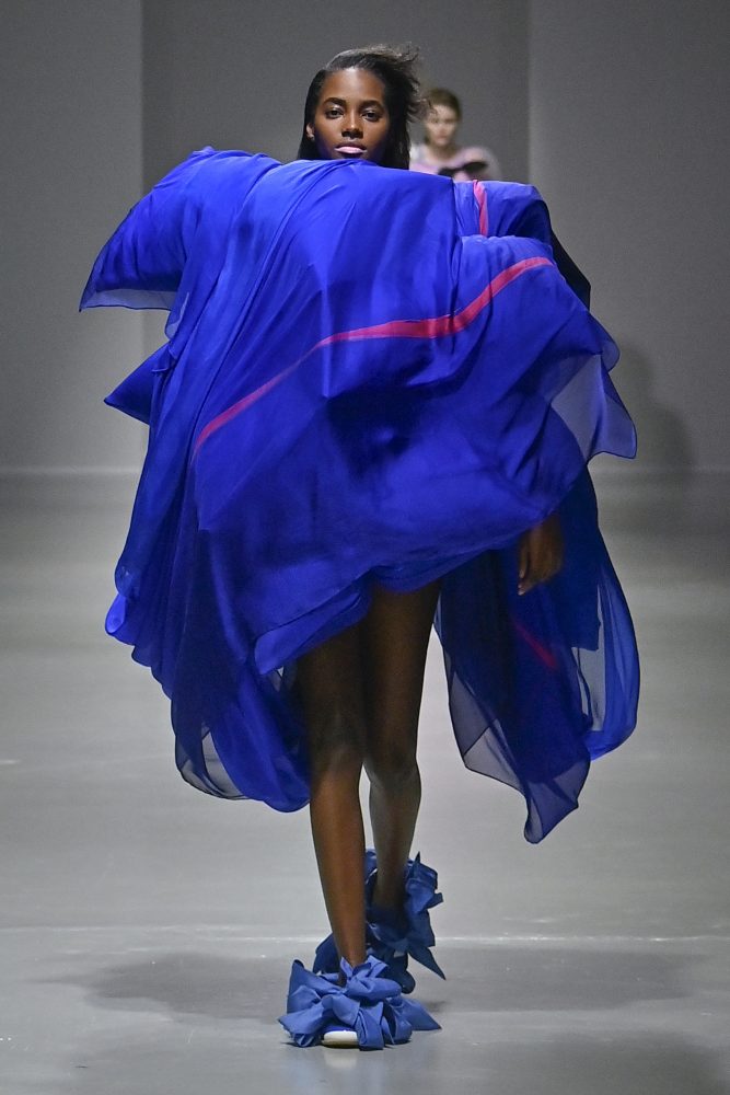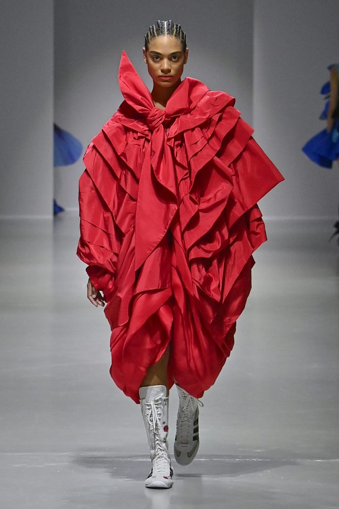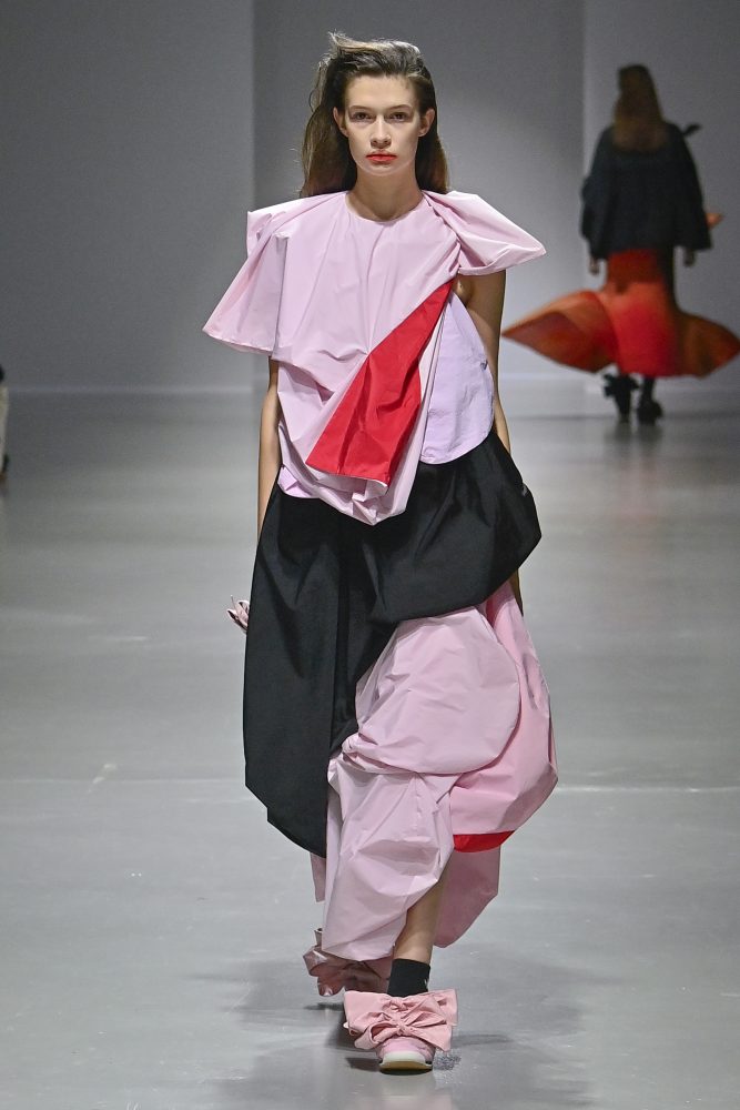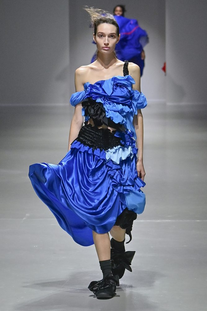 Hú, inspired by movement and volume, included a live performance by dancers Emma Portner and Léo Handtschoewercker. Many new silhouettes in the collection include the idea of freeze framing pieces in movement, shaped by using boning and wire at the hems of skirts and dresses or playful shapes of garments that look as if they have been tugged on one side by a door. Hú captured the romantic details of pieces in unintentional moments.