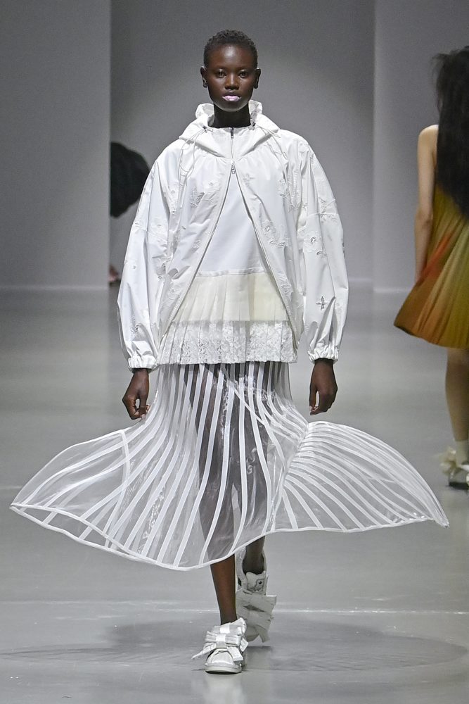 Key fabrics in the collection include silk taffeta, technical fabrics used in sports/performance gear made to look like taffeta, printed silk organza, fine stretch jersey that have the appearance of organza and hand knitted tops. Hú infused her signature smocking technique and continued her partnership with French lace company, Sophie Hallette to create tulle lace appliques.
