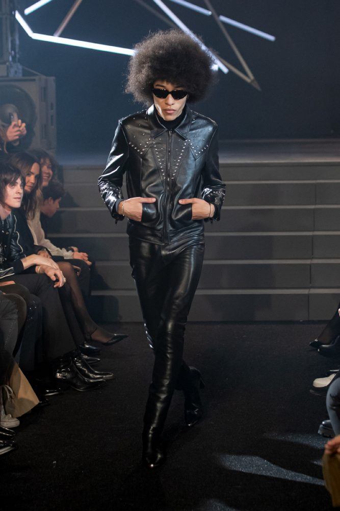 Key to the collection, the tight black leather Celine pants, are paired in “double leather” with biker and racer jackets customized with studs or rhinestones. The Celine coats are worn oversized and are cut out of cashmere or English tweeds recreated on a traditional loom. The Celine suits are slightly raised, worn with cropped flared trousers. The embroideries are handmade in the Parisian couture ateliers. The giant leopard and tiger printed coats are made from shearling cashmere.
