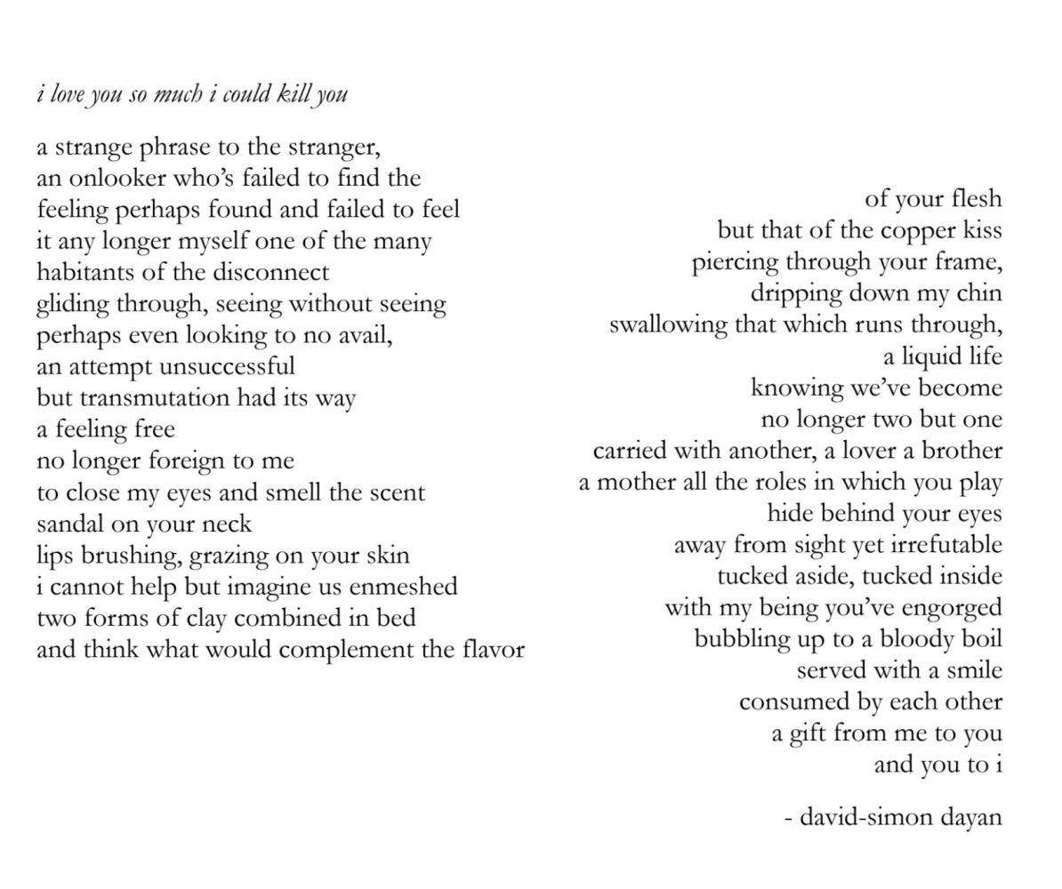 Confronting depressive desires in a seemingly endless battle with self-acceptance, Dayan explores the desperate search for adoration, in hopes it may provide an antidote. This chapbook serves to confront self-loathing, to witness the roles insecurity and rejection play in the search for love of oneself, seeking a tenderness that celebrates softness, one that subverts toxic masculinity and the hatred the queer community is conditioned to internalize.