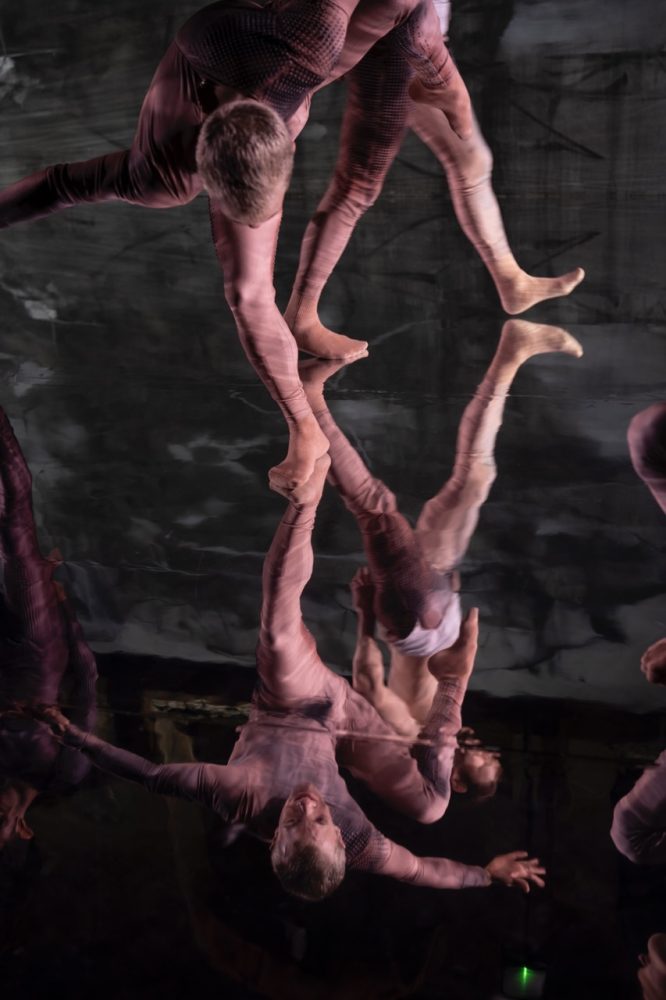 The performance unfolds on a mirrored dance floor, reflecting both the performers and audience, furthering Rouy’s themes of distortion and transformation. Dynamic lighting systems amplify the mood, oscillating between austerity and crisis, while costumes designed by British fashion house 16Arlington, in collaboration with Rouy, embody the tension between constraint and fluidity.