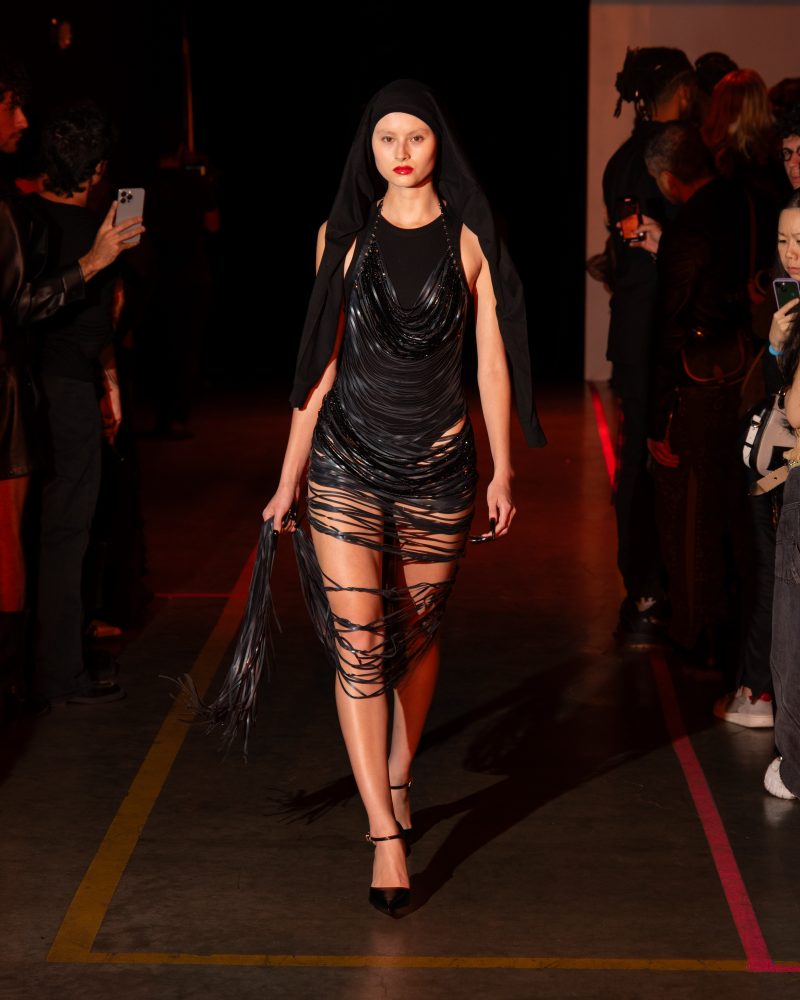 The collection was composed of latex, leather, corsetry, jersey and workwear. With the latex being sourced from LA’s BustedBrand and additional shoe covers, rubber spikes, necklaces, earrings, that were created in collaboration with Aslan World.