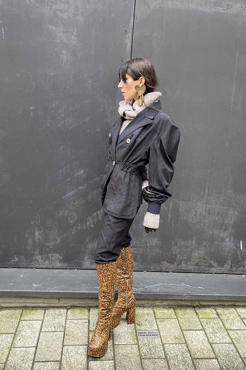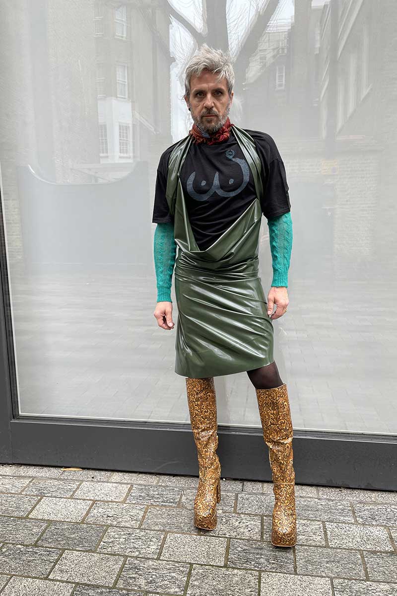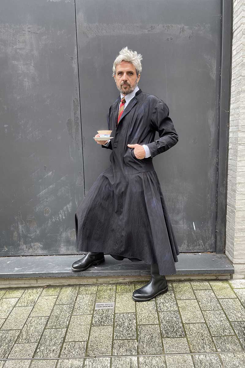 Who is this intellectual in a black gown, beautiful boots + silver hair, drinking his cup of tea? ‘Andreas’ couturier puts women on a pedestal, clothes R transformative, dress is an expression of personality + aspiration.
