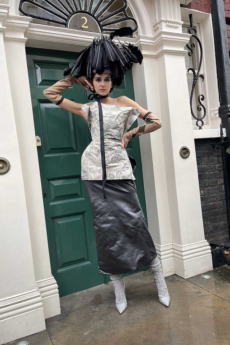 We thought of Eliza + her strong personality when we styled the new collection. “All I want is a room somewhere…” – selling flowers – hand-knit tit-warmer, fairy tutu, snake-coloured tights, satin sandal clompers; she could have got from a charity shop; she is protected by Pygmalion – Higgins’ Tattersall check cardigan-coat.