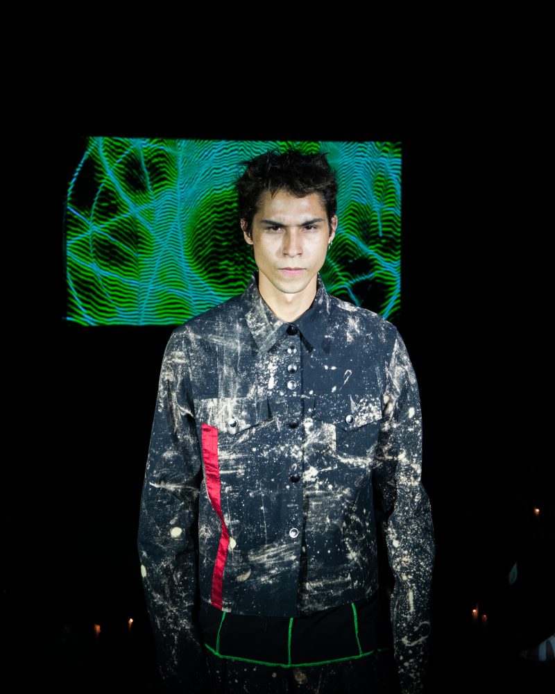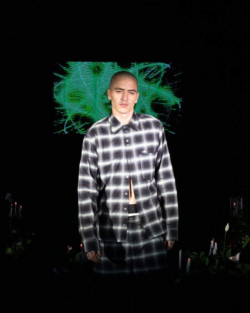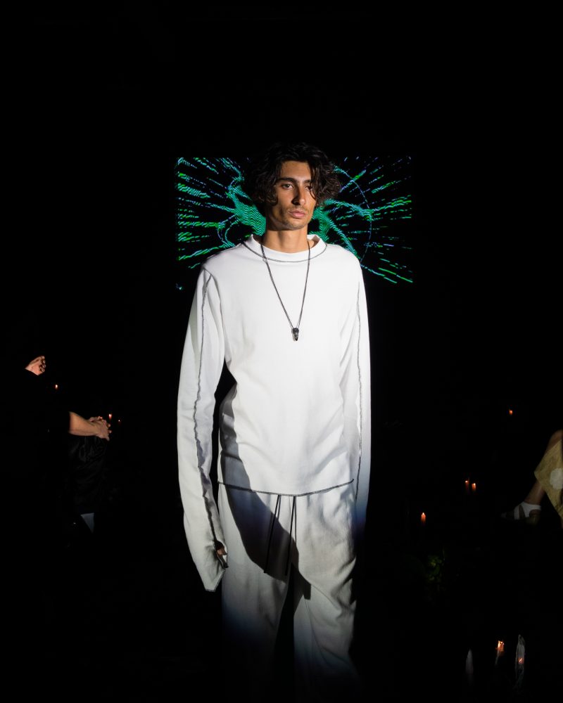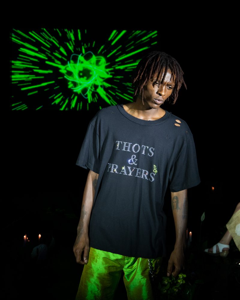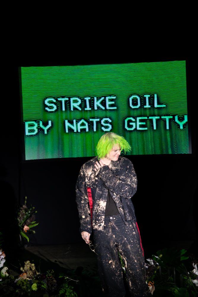 Reserved friend Nats Getty presented his first runway show for Strike Oil which focused on unisex acidic rave details spanning from leopard print 2 pieces, Mountain Dew green piping on overlock bodices and a bountiful spray of bleach treated tie dyes. The latest addition to the wardrobe came with the naughtiest details of Swarovski pixel wording at the most dense.