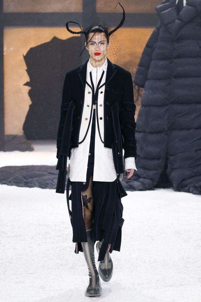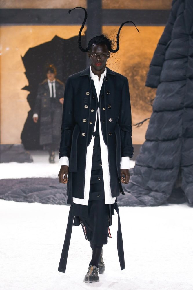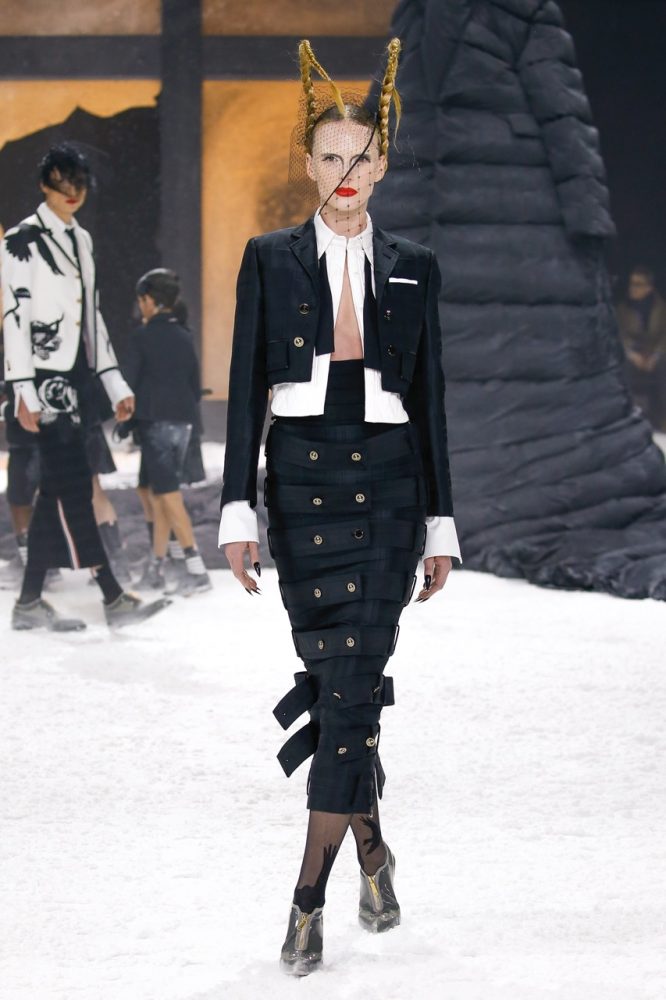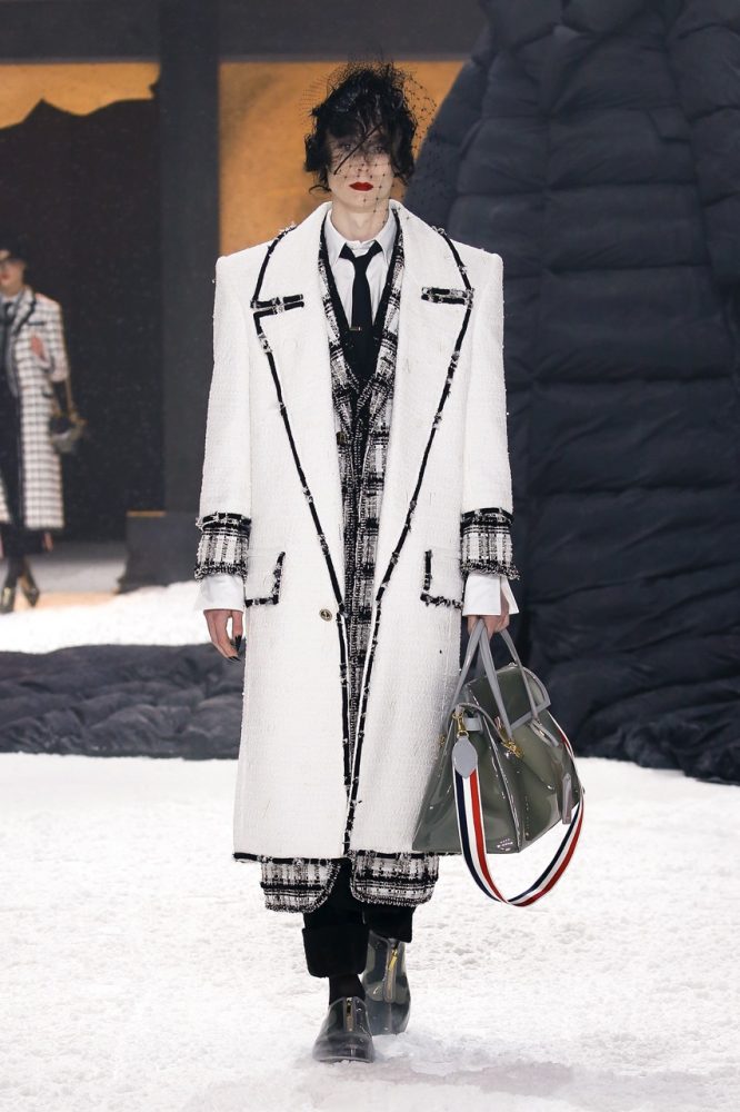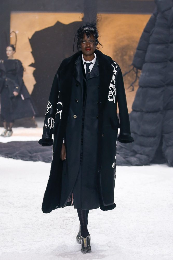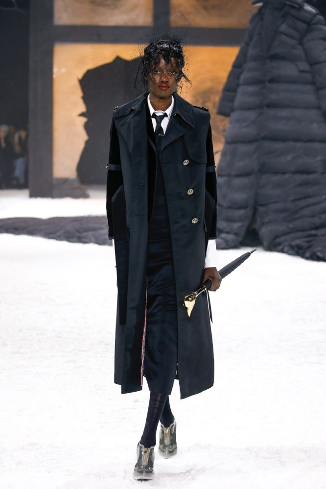 the thom browne fall 2024 women’s and men’s collection was brought to life by a special retelling of edgar allan poe’s the raven, narrated by american actor carrie coon.