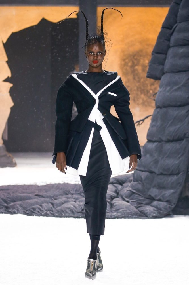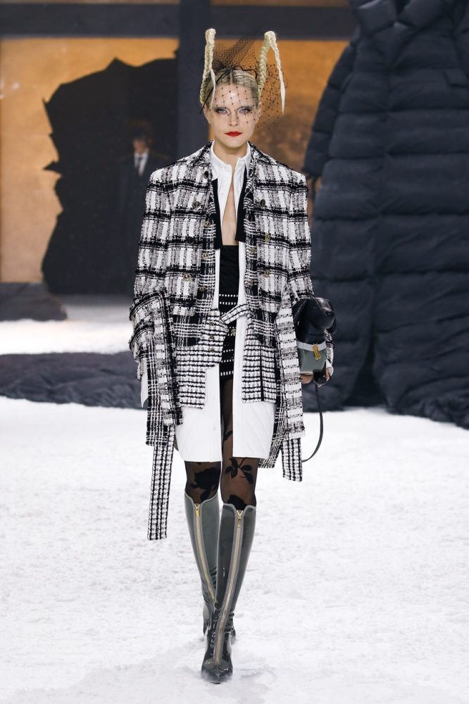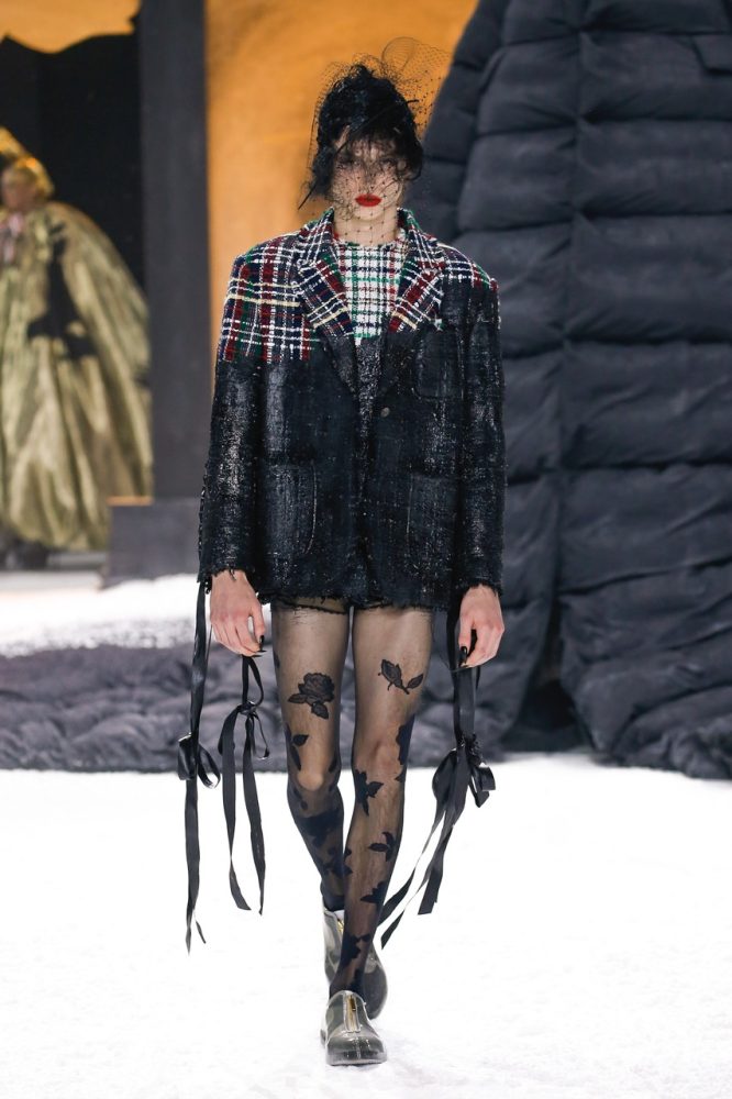 black tie ensembles are deconstructed and transformed into modular panels which button on and off one another. these body-skimming looks give way to cinched silhouettes made of dissected tailoring. some in fun-mix tweed and tartan made of grosgrain ribbons, others in intarsia and wool cashmere—all defined by an hourglass shape.
