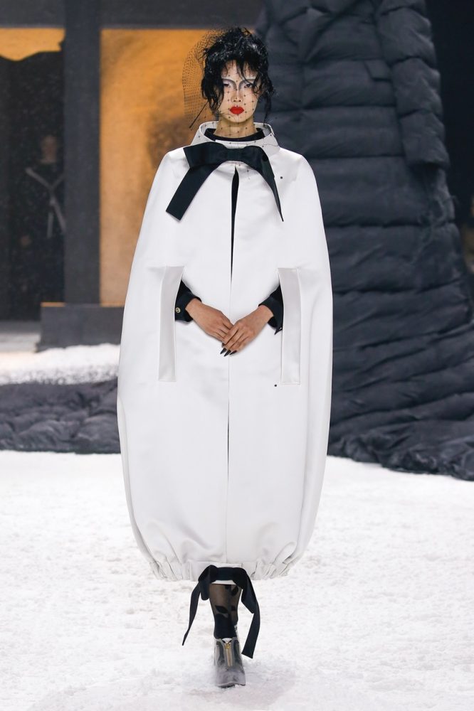 slow and steady, two figures in complementing black and white cashmere dresses. their gathered blouson capes in white silk satin and black moiré accented by bows. followed by boatneck poof dresses framed by intarsia cricket stripes and tweed skirts.