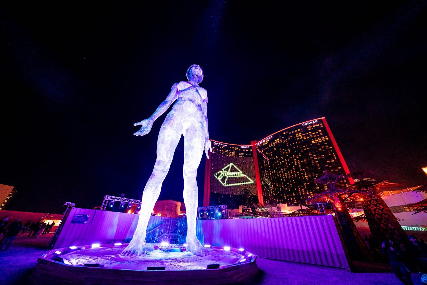 The endless dusting of lights and hotel room silhouettes enrich the mythology of the city that never sleeps, Las Vegas. On this last trip to Resorts World Las Vegas, the luxuriant accommodations acted as a balance to the fiery sights outside the building’s doors. The latest attraction to come on to the strip offers up a taste of contemporary art with a microdose of Burning Man. TRANSFIX co-founded by experiential entrepreneurs Michael Blatter and Tom Stinchfield, offers up a subversive take of the type of art that would typically represented Vegas whilst also platforming creators in supporting their works and letting the rest of the world see the starry sights and accompanying sounds.