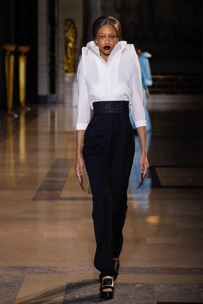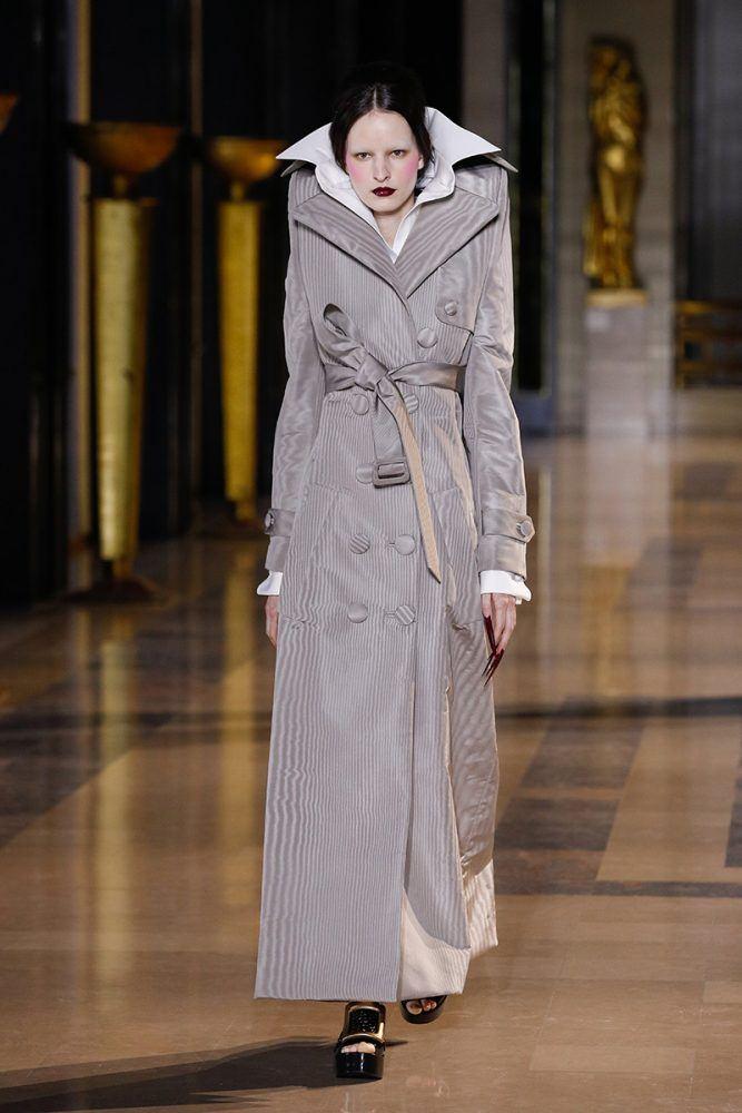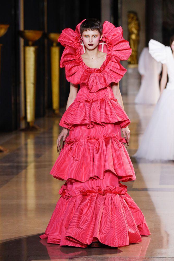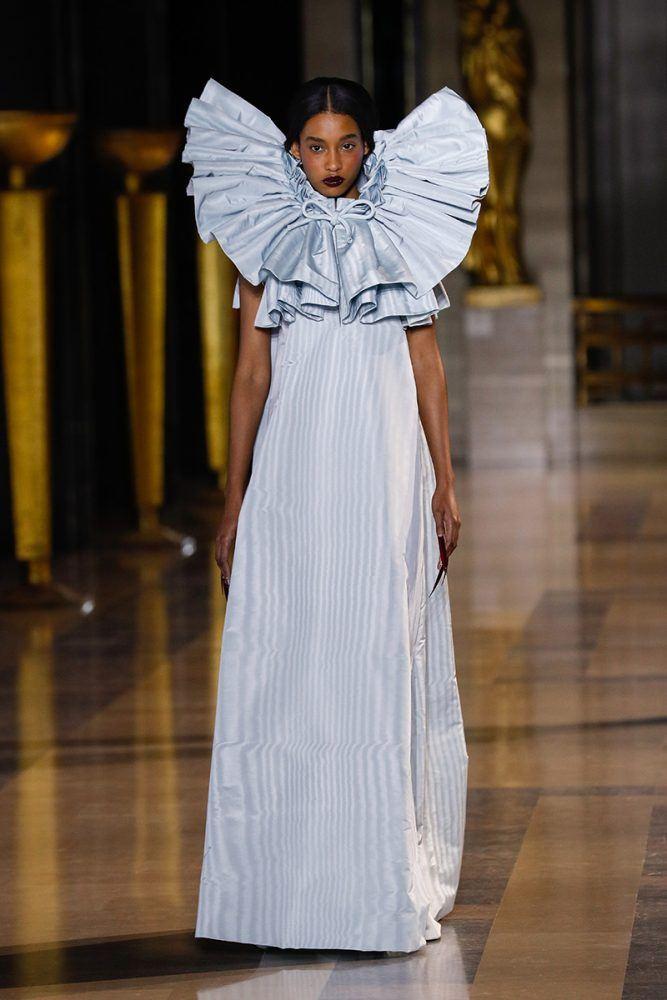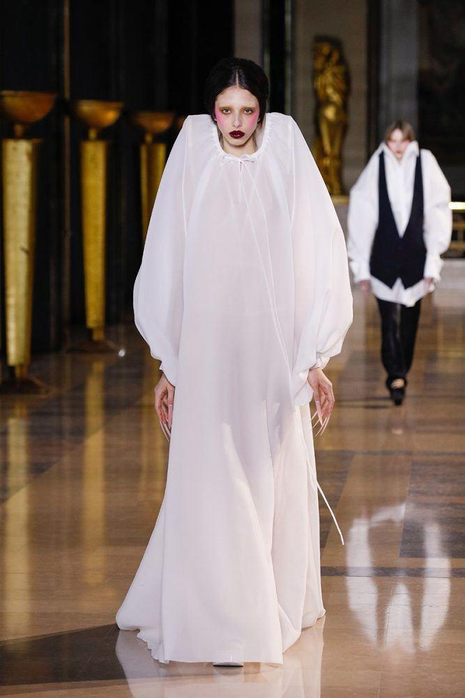 Fabrics are either crisp or gauzy, but always compact to support the architectural shapes.