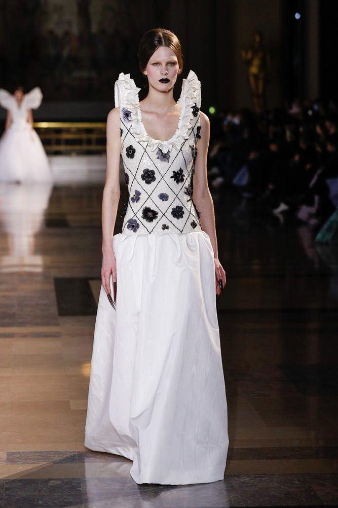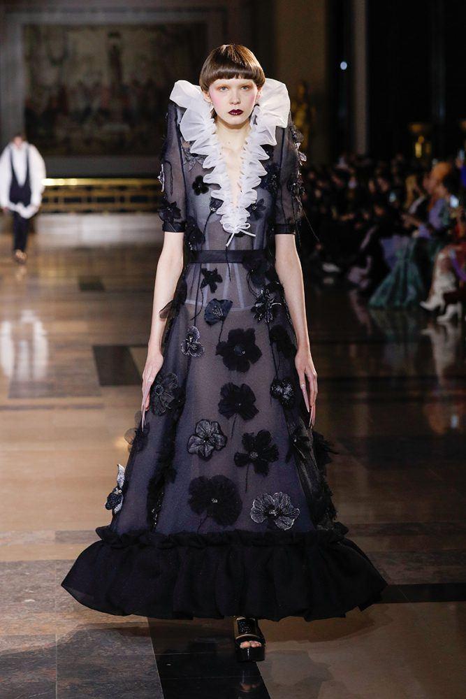 The only decoration can be found on a trio of floor-length evening dresses in black and white, pale pink and black. Each one is hand embroidered in artwork of diaphanous, wilting flowers, executed in scraps of delicate fabric, beads and paillettes.