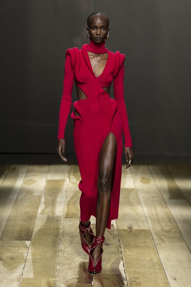 “Human anatomy, the anatomy of clothing, the anatomy of flowers. An exploration of beauty and power through tailoring and tailoring fabrics and a focus on cut, proportion and silhouette. The foundations of fashion, cut on the body and inspired by the body within. The classic subverted: turned inside out and upside down. Volume is neat – strict – or exploded. Garments are dissected: slashed, sliced and twisted. Shoulders are strong. Waists are narrow. Heeled trousers elongate the leg: the bumster in reverse. The most prominent motif in the collection is the orchid, in its rarer forms cultivated but, after the daisy, the most common flower. It thrives in the air, resists being rooted and grows in the wild. Extraordinarily beautiful and infinitely adaptable, the orchid mimics both predator and prey. In the language of flowers, the orchid is a symbol of love.”