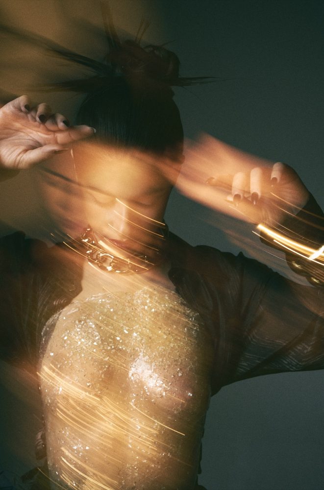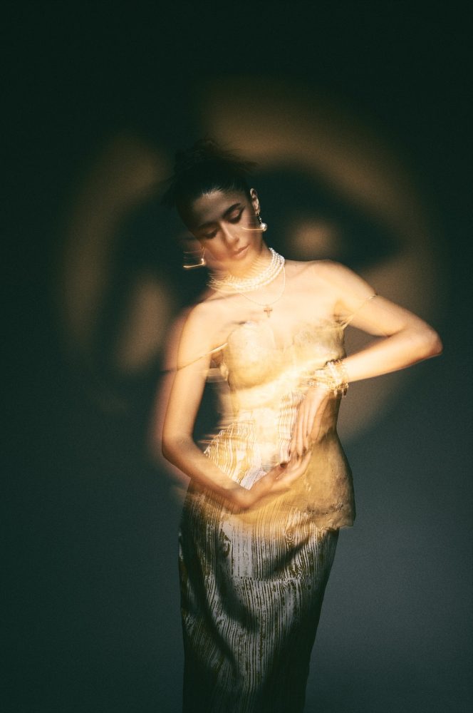 Oliver Tolentino top, Planet Féin top, and Saint Moran jewelry