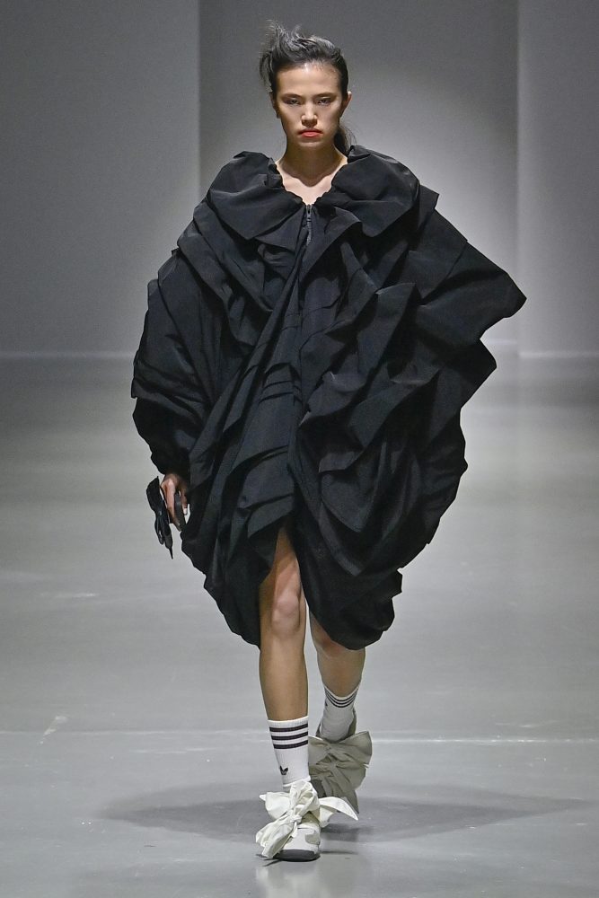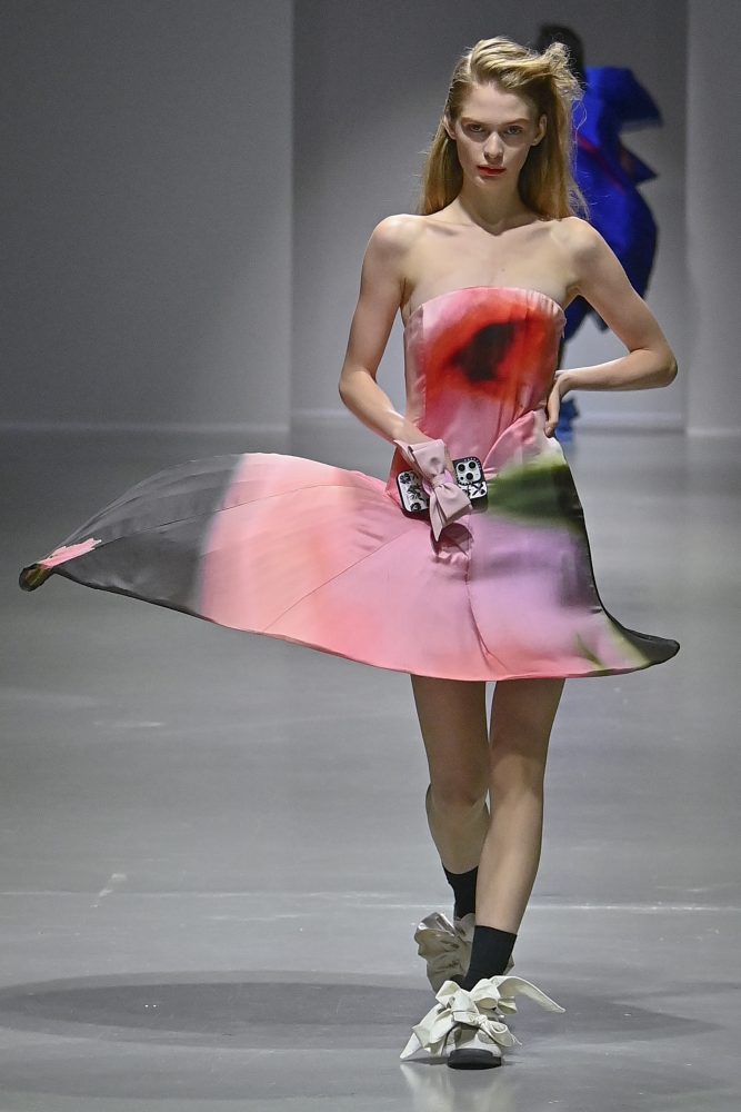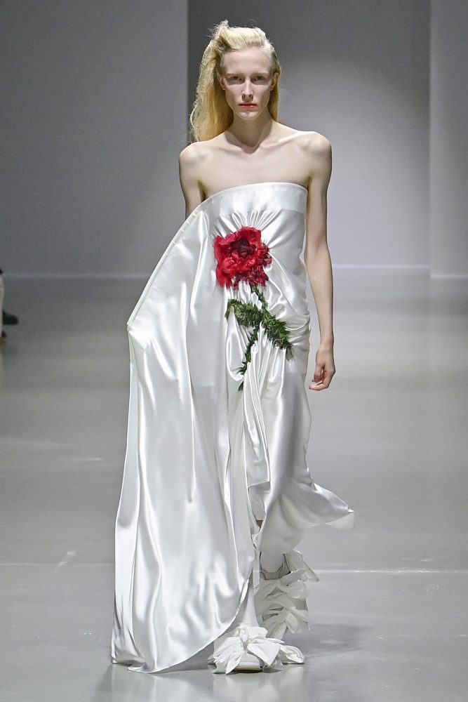 Hú, inspired by movement and volume, included a live performance by dancers Emma Portner and Léo Handtschoewercker. Many new silhouettes in the collection include the idea of freeze framing pieces in movement, shaped by using boning and wire at the hems of skirts and dresses or playful shapes of garments that look as if they have been tugged on one side by a door. Hú captured the romantic details of pieces in unintentional moments.