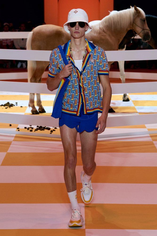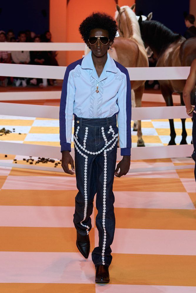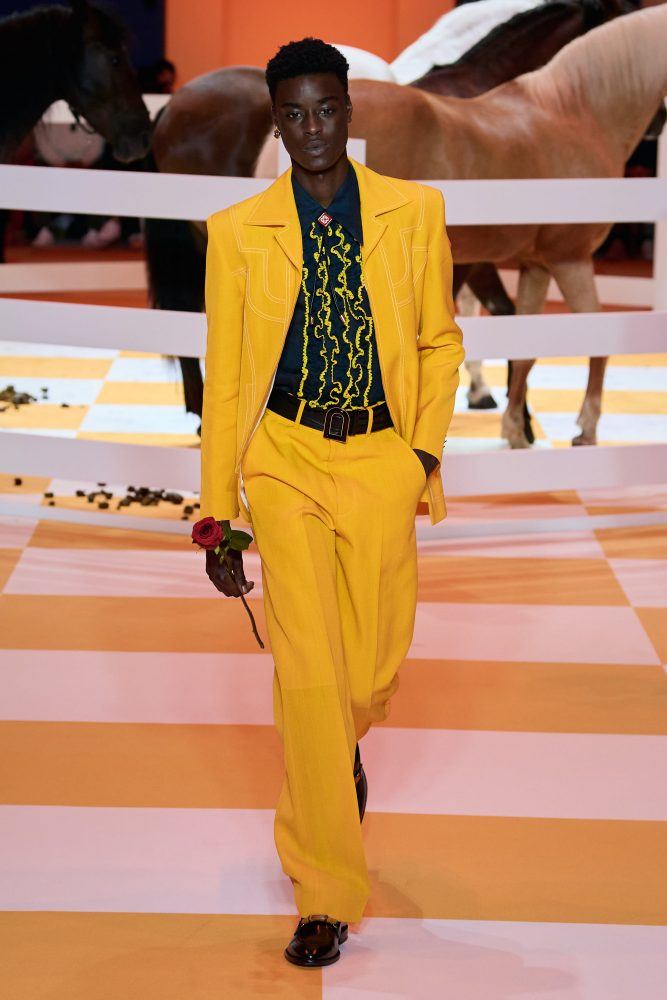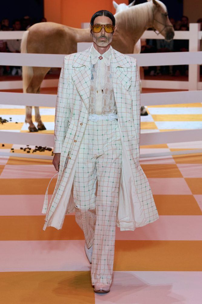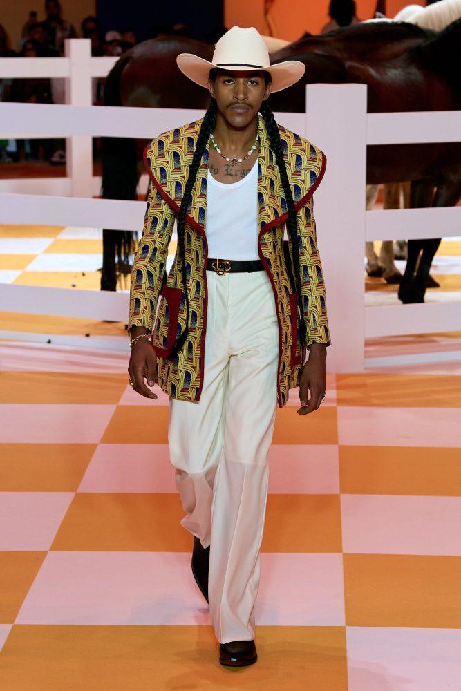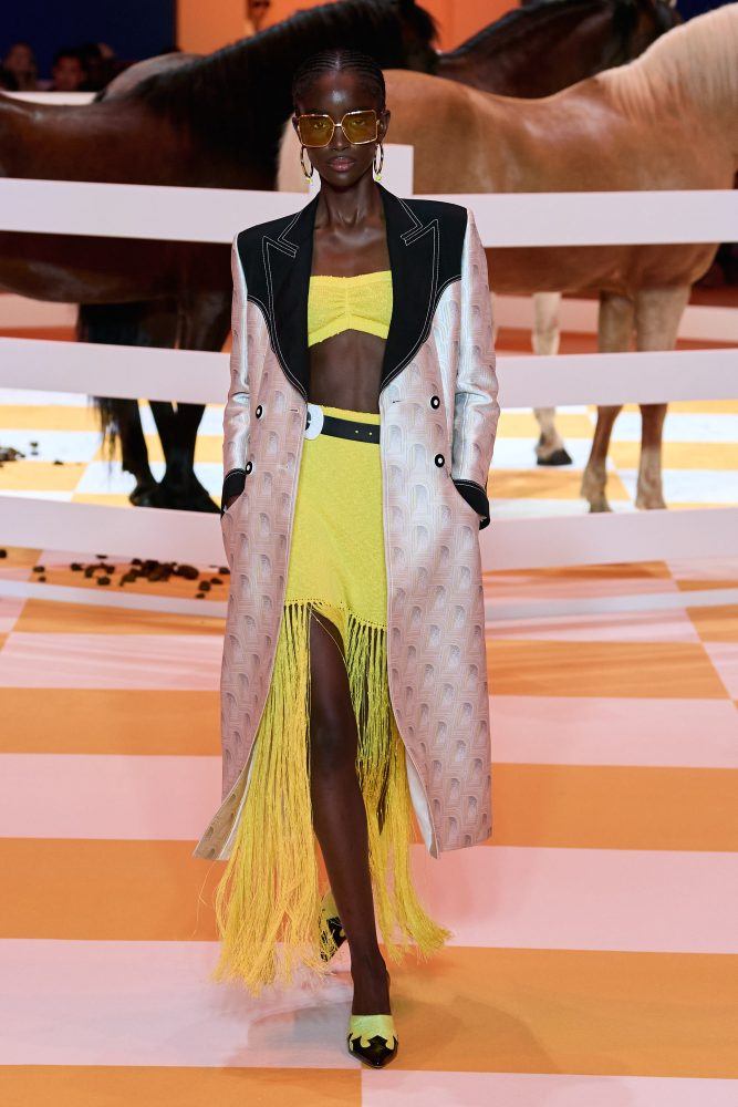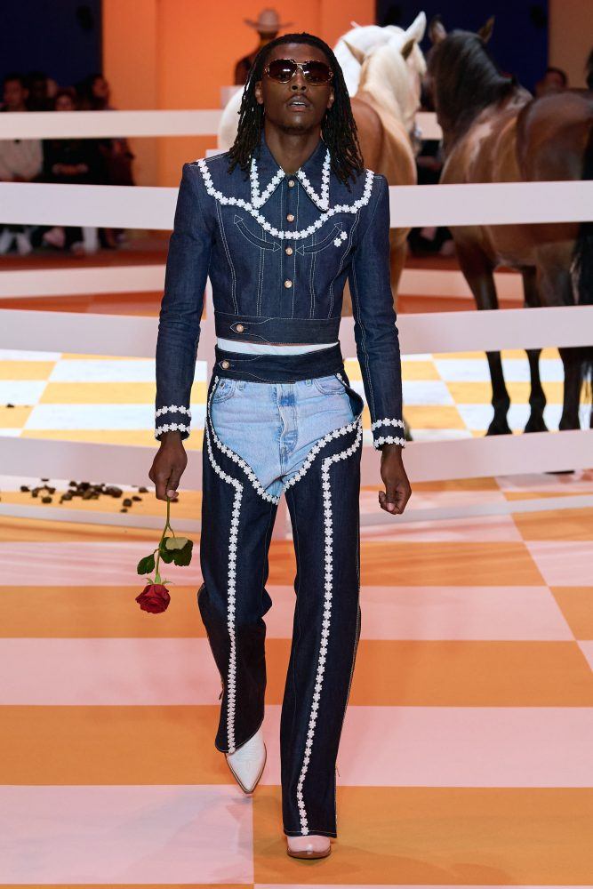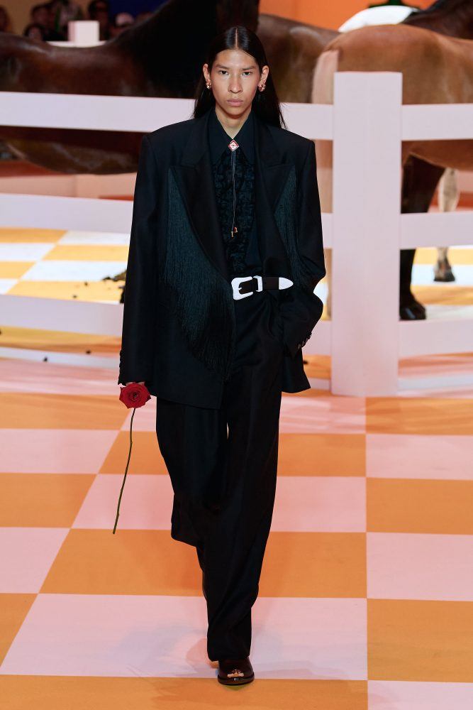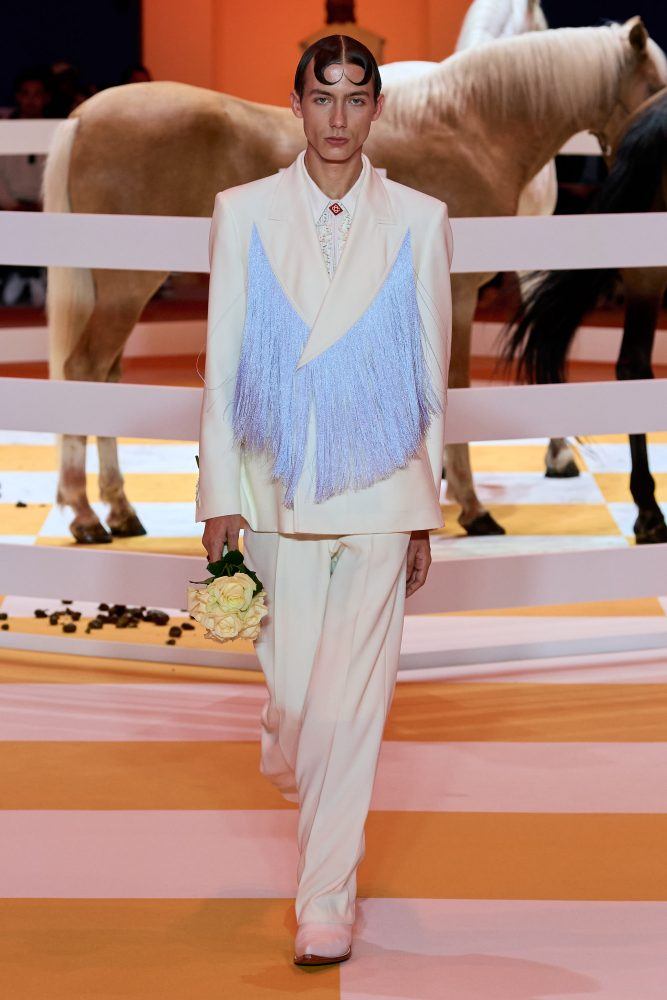 For Spring/Summer 2023, Casablanca presented Futuro Optimisto, a collection that focused on Vaqueros, Phantastica, Nature + Architecture. Incorporating Oaxacan craftsmanship and conjuring romanticized rugged riding beauty explored the west coast lifestyle. Casablanca took a surrealistic take on the prairie chic embracing a psychedelic interpretation on the cowboy’s attire. The extension of nature was prevalent in the various textiles and which futurism incorporated a sense of meditative cosmic consciousness. These dreamy pieces were further works of Zeny Fuentes y Reyna a Oaxacan based artisan-led workshop which interpreted the hallucinatory animal imagery from Pedro Linares. With technologically embracing recycled threads in their outerwear, the collection was a fantastical way to guide the conversation of sustainability and worldly appreciation for indigenous crafts.