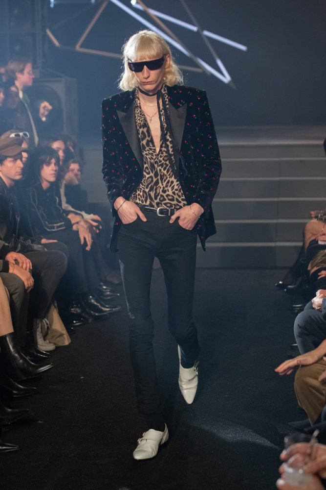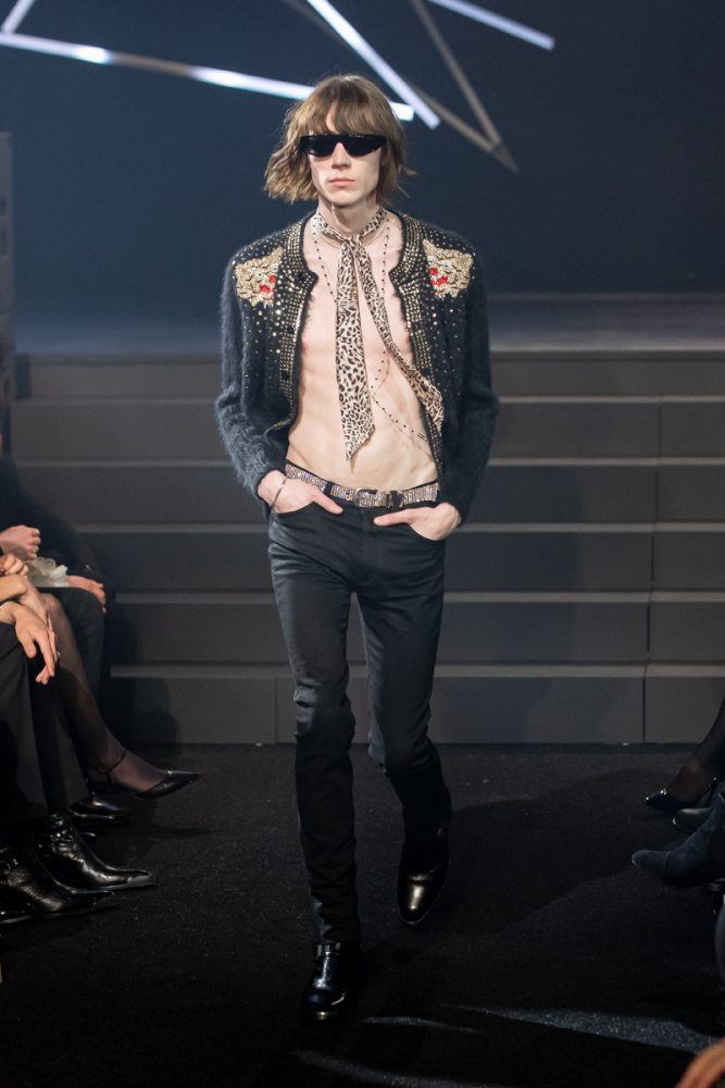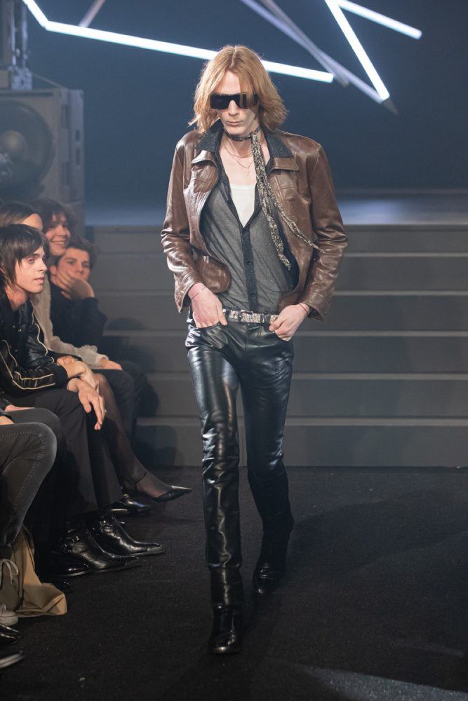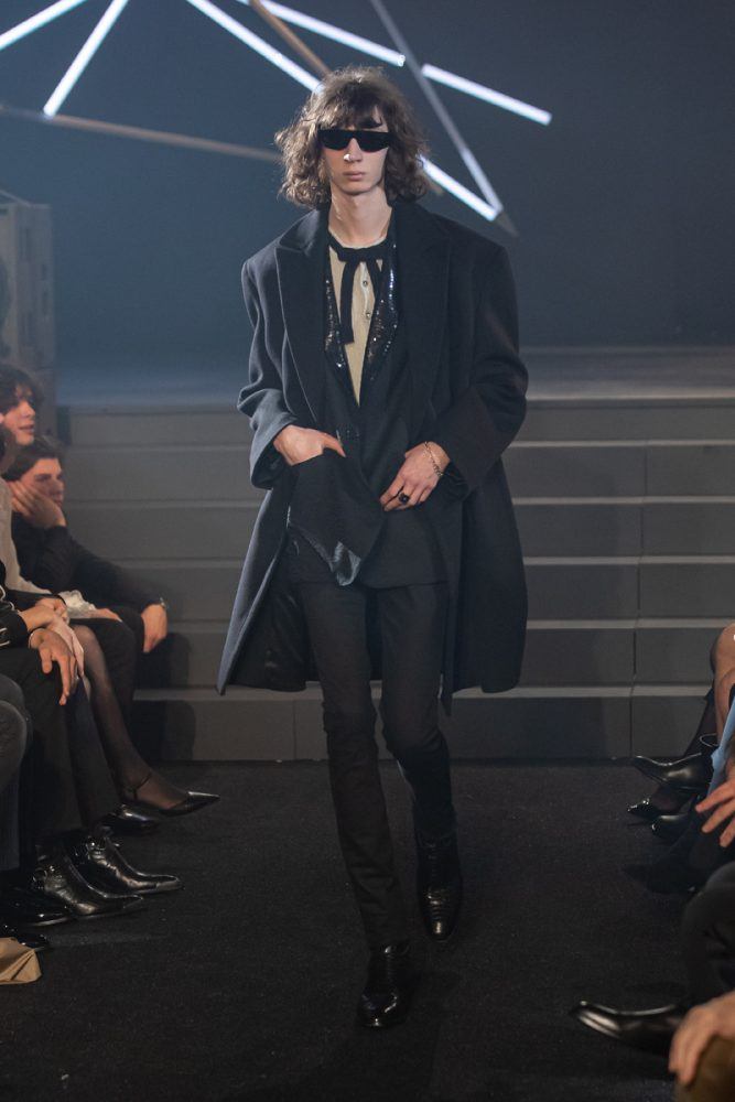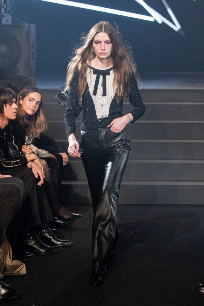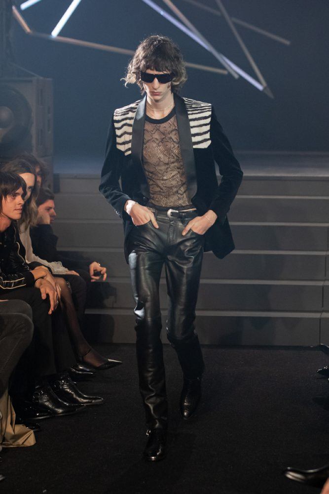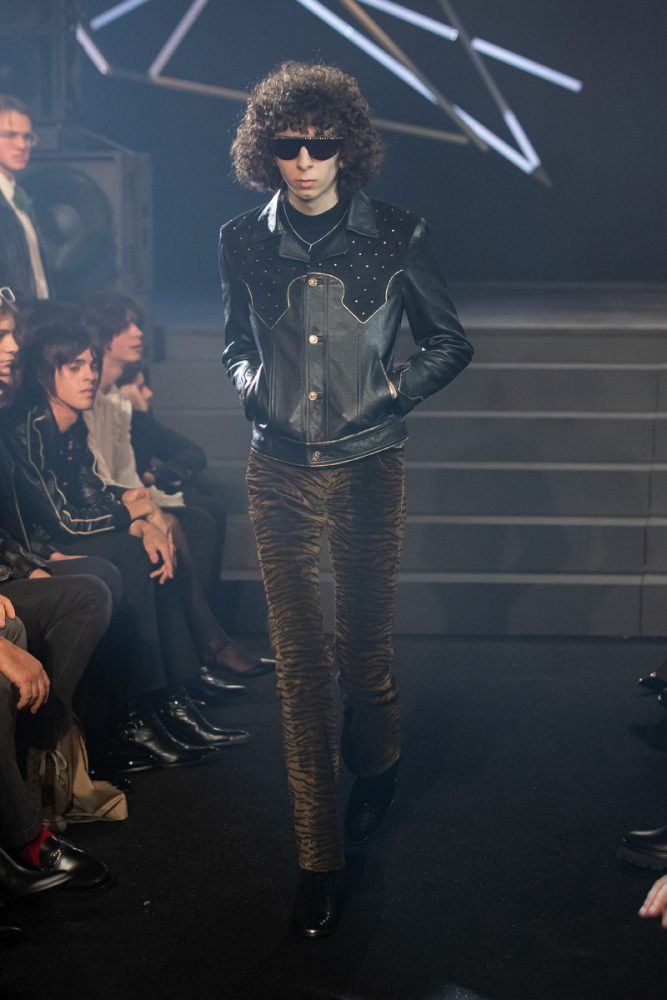 Key to the collection, the tight black leather Celine pants, are paired in “double leather” with biker and racer jackets customized with studs or rhinestones. The Celine coats are worn oversized and are cut out of cashmere or English tweeds recreated on a traditional loom. The Celine suits are slightly raised, worn with cropped flared trousers. The embroideries are handmade in the Parisian couture ateliers. The giant leopard and tiger printed coats are made from shearling cashmere.