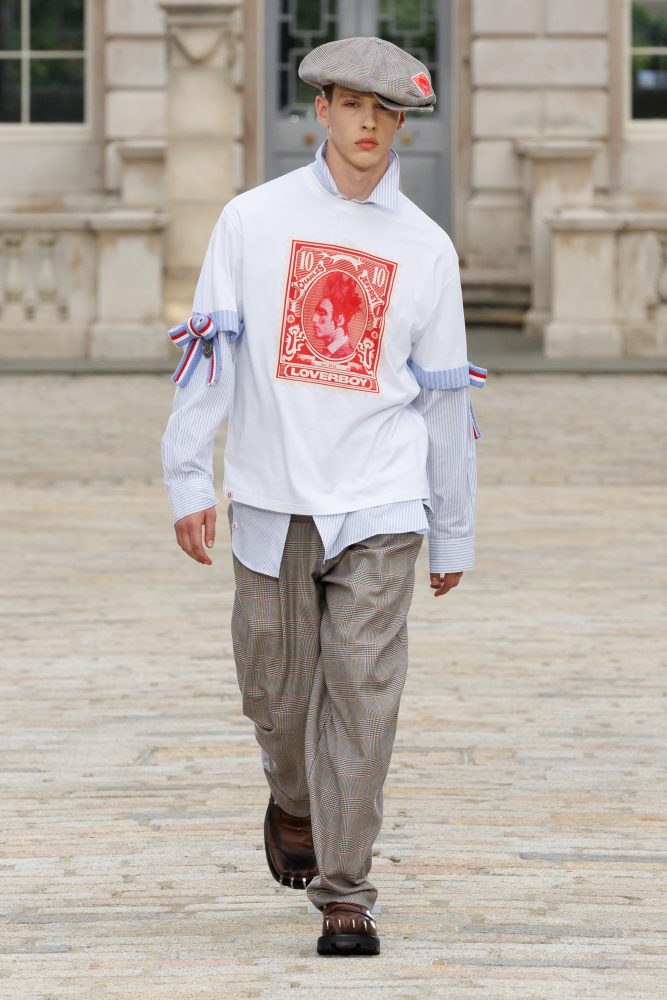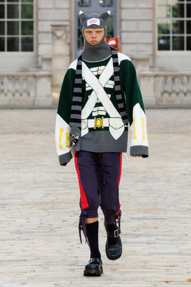 10 marks our return to London, the city that birthed our brand, and a wider celebration of our first decade hosted by Somerset House, home to our studio since 2016. It coincides with the opening of our first exhibition, The Lore of LOVERBOY, and is moulded by a broader reflection on our distinctly British approach to style. We continue to offer puckish takes on traditionally masculine conservative signifiers, this time from spheres of military and gamekeeping, looking to upend and question the enduring status of these symbols. The collection also nods towards our own history and hero garments through new ‘animal familiar’ takes on the iconic ears beanie and our Warholian banana motif rendered oversized and overripe in black velvet. Through our partnership with The World of Clash, we’ve been led back to SS18’s piercing arrows, this time less apfelschuss and more Saint Sebastian and a reimagining of the wedding dress finale inspired by the mobile gaming franchise’s character, P.E.K.K.A.