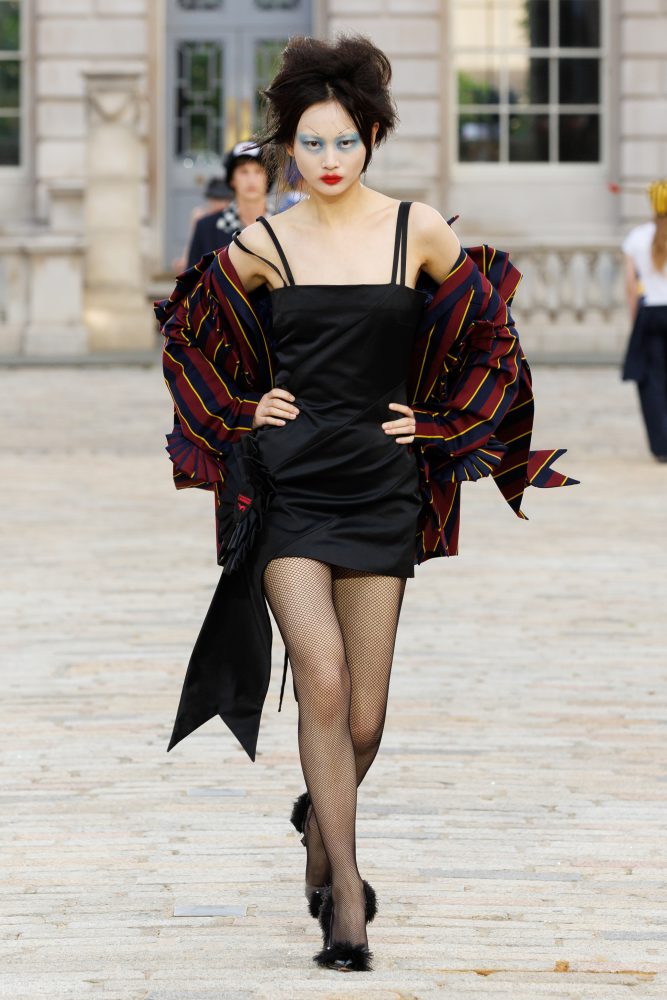 Our design process was led by consideration of the ways that clock-time shapes social life and thus becomes tied to expectation and notions of respectability. Nods towards nightwear and undergarments jostle against references to formality and outerwear, in a muddling of sartorial codes of labour and leisure, public and private. Through drape and deconstruction we’ve sought to cultivate a sense of becoming and undoing, evoking clothing pulled hurriedly around the body and the gradual unravelling of a look over the course of a day. Ringed eyes and tousled hair hint further at the realm of slumber, refracted through a distinctly post-punk sensibility.