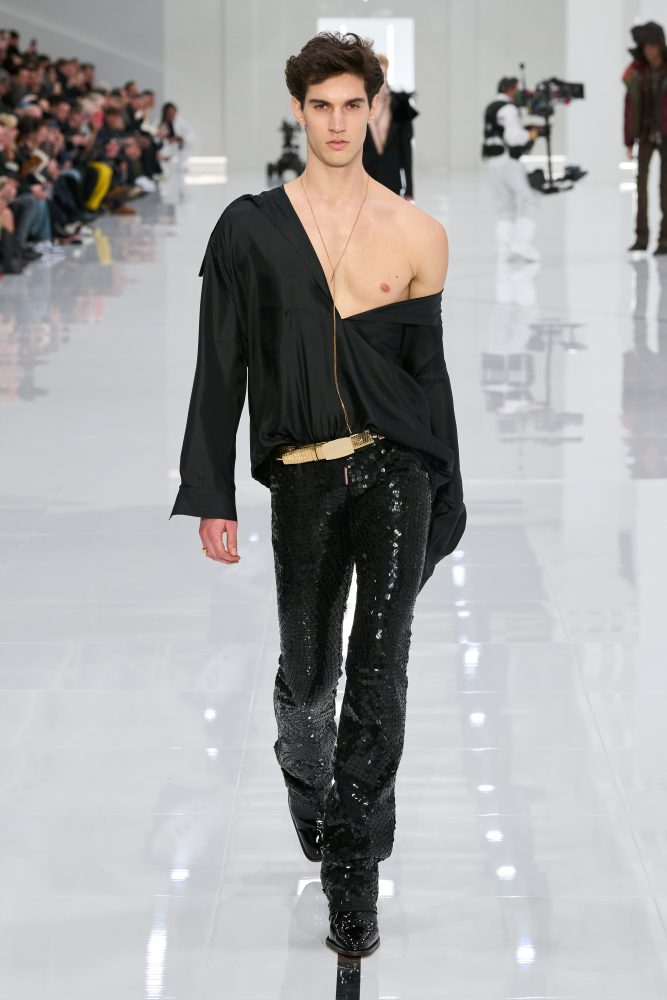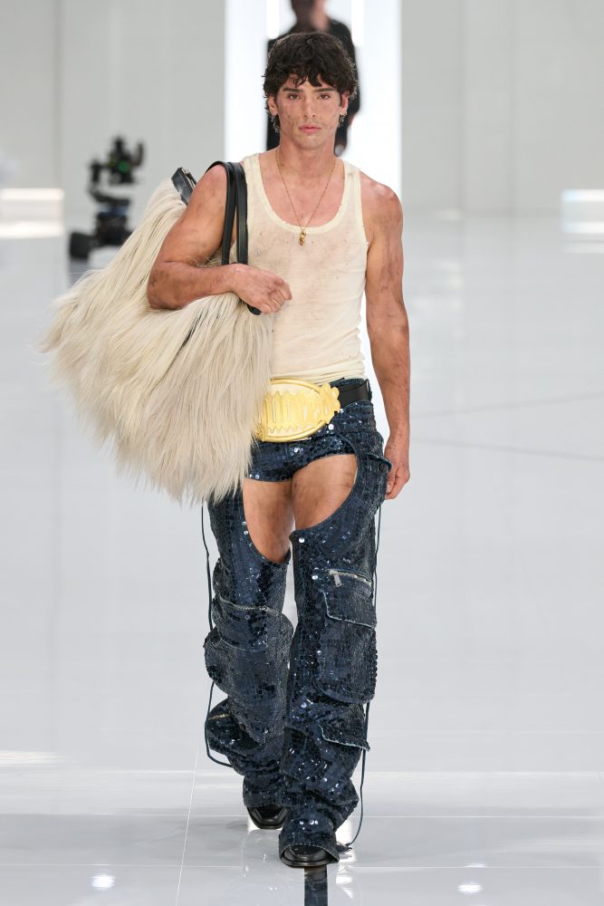 Jersey shorts with holes, white cotton tanks, trapper hats, vintage look shearlings and patched and worn denim dominate the men’s day looks. By night they get a glow up, to transparent chiffon shirts with studs details that open to the waist, low slung pants with a flared ankle in sparkling velvet or glossy printed python leather, a coordinated silver sequin bomber and pants and slinky lurex knits worn with clutches featuring back to back D2 gold hardware.