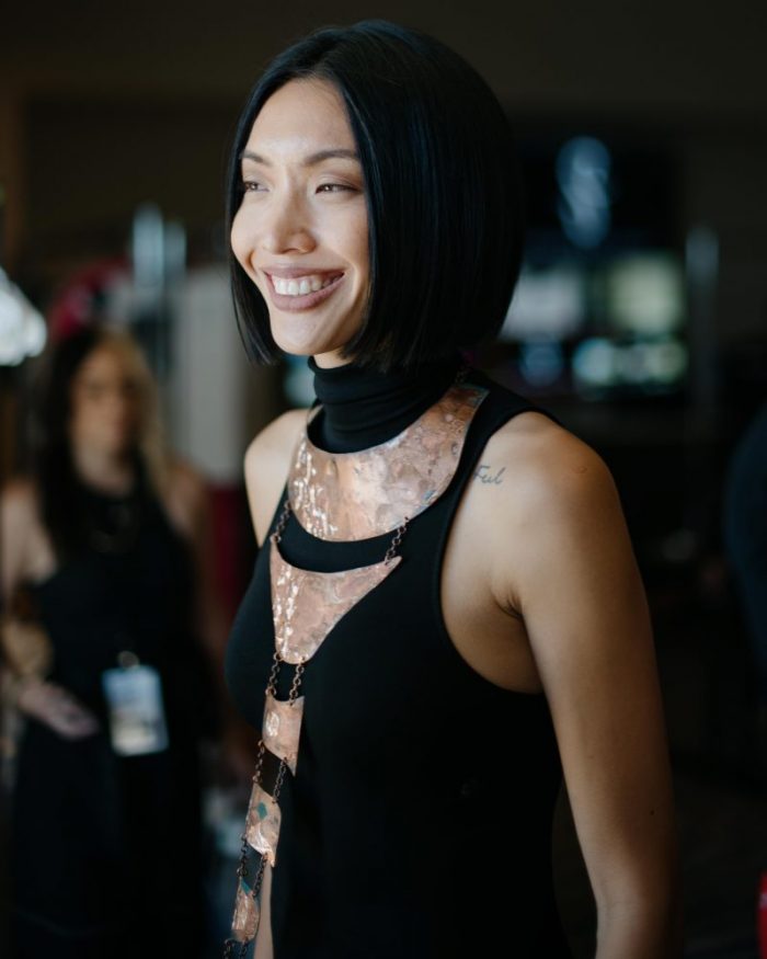 Jennifer’s ability to intricately move metals with metal and naturally patina her copper pieces is immaculate. Not only did she grace us with her artistry; Jennifer’s statement pieces gave the models more empowerment. The silver and copper were armor-like, giving us the real Wonder Woman. One statement piece being a Tináa, a copper shield used by the Tlingit People. Another look, ‘Armor for the soul’ had me in a daze! This was EVERYTHING.