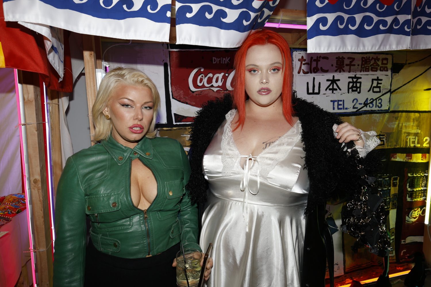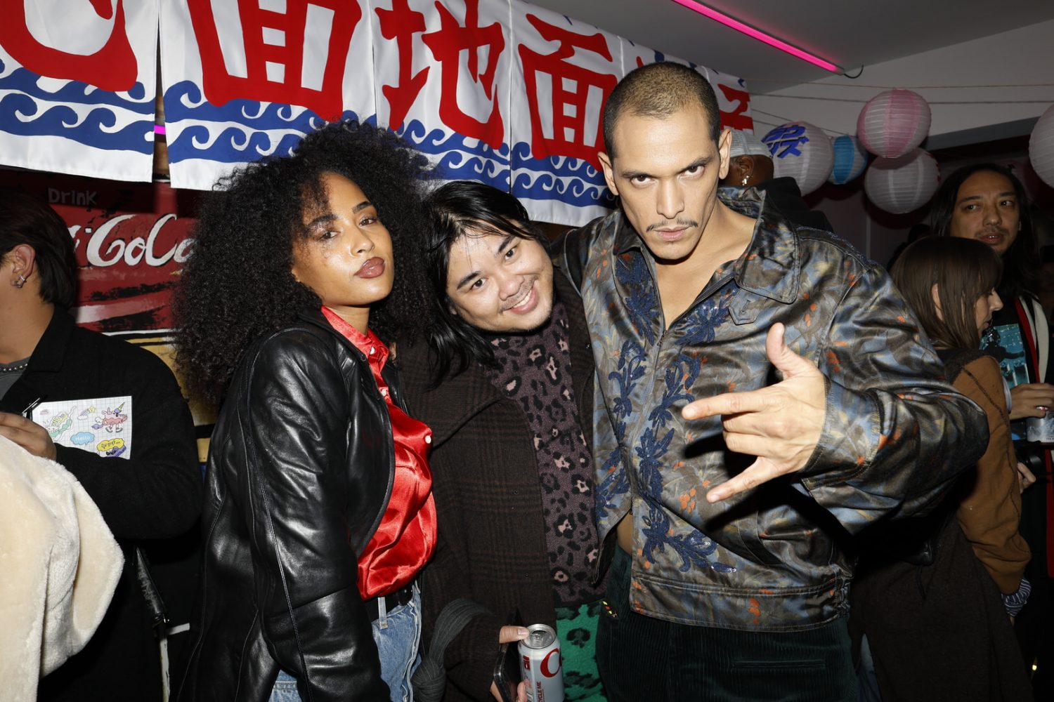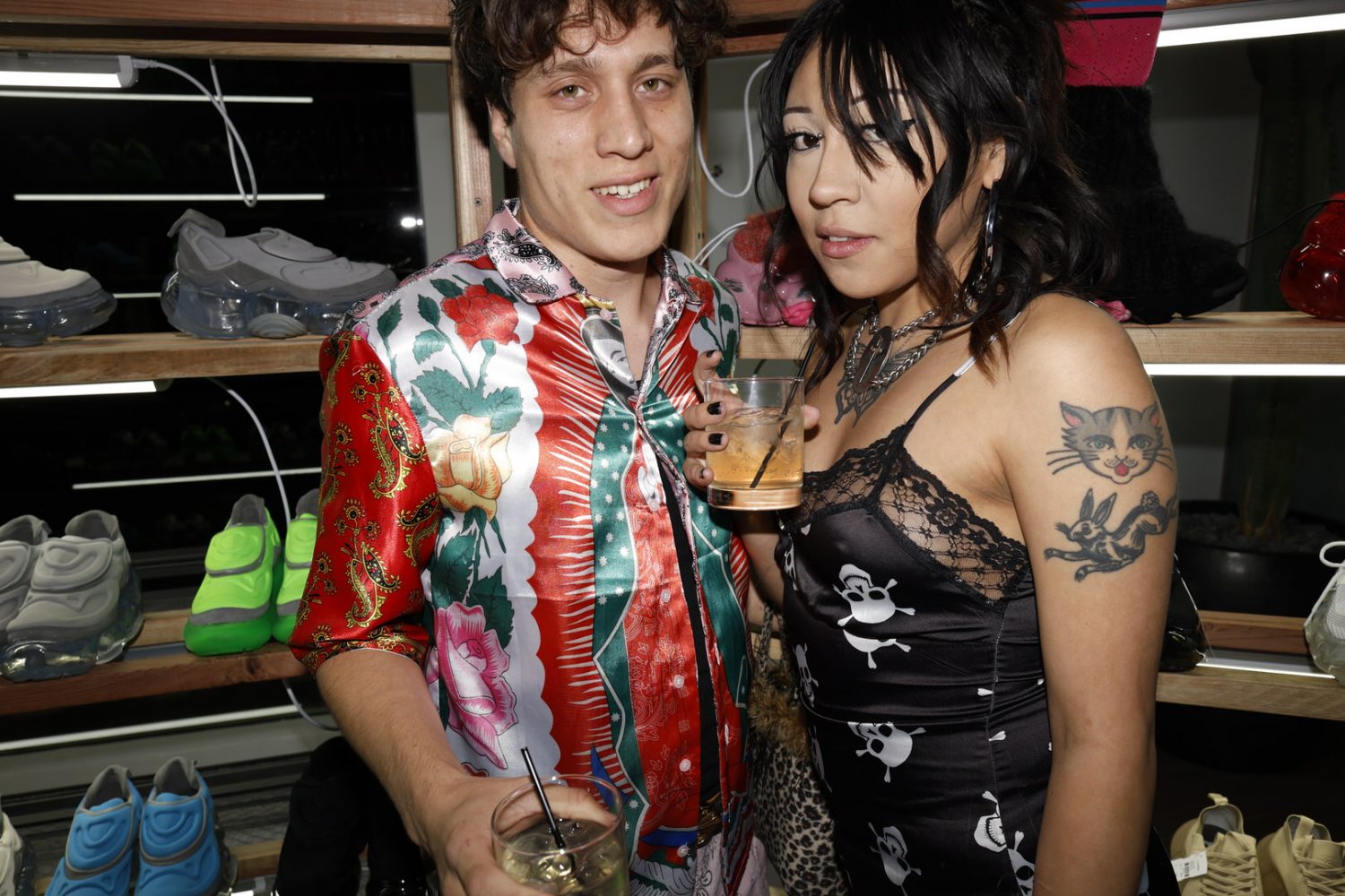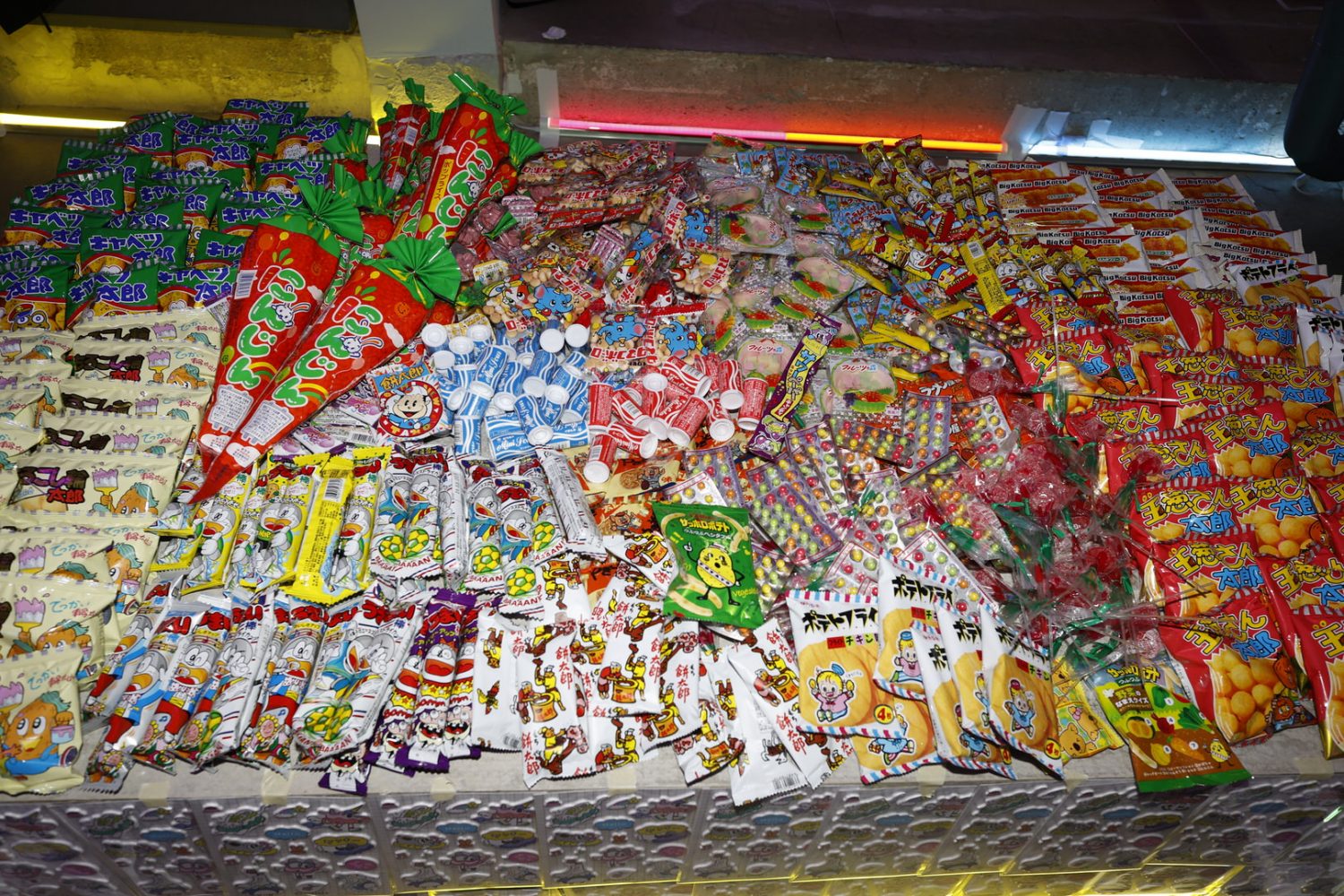 The installation takes over the prime basement level of the H Lorenzo Men’s store, building out a Tokyo street market in the space featuring neon lights and a kaleidoscopic signage. Every table and available surface was healthfully scattered with Japanese candies and treats. For the opening night the store blared with hyperpop provided by ko aka koala while an eclectic array of the night time’s brightest stunted and provided life to the street market backdrop.