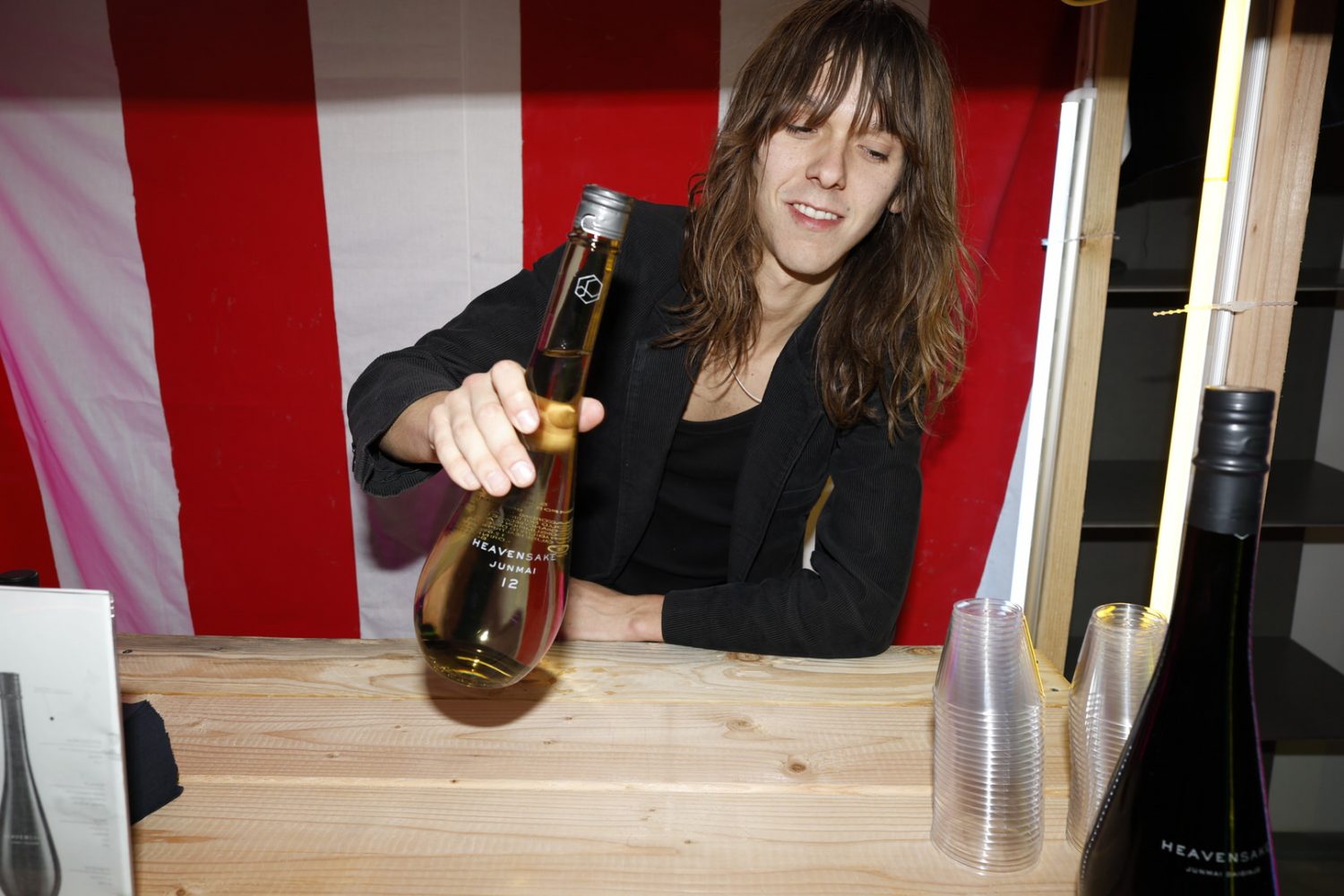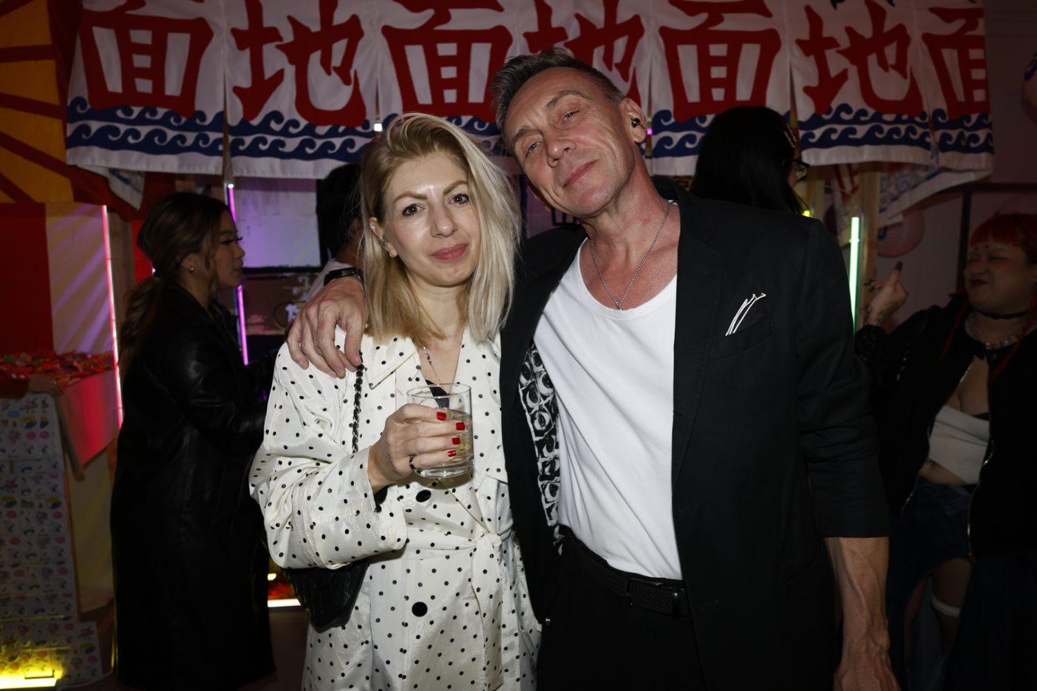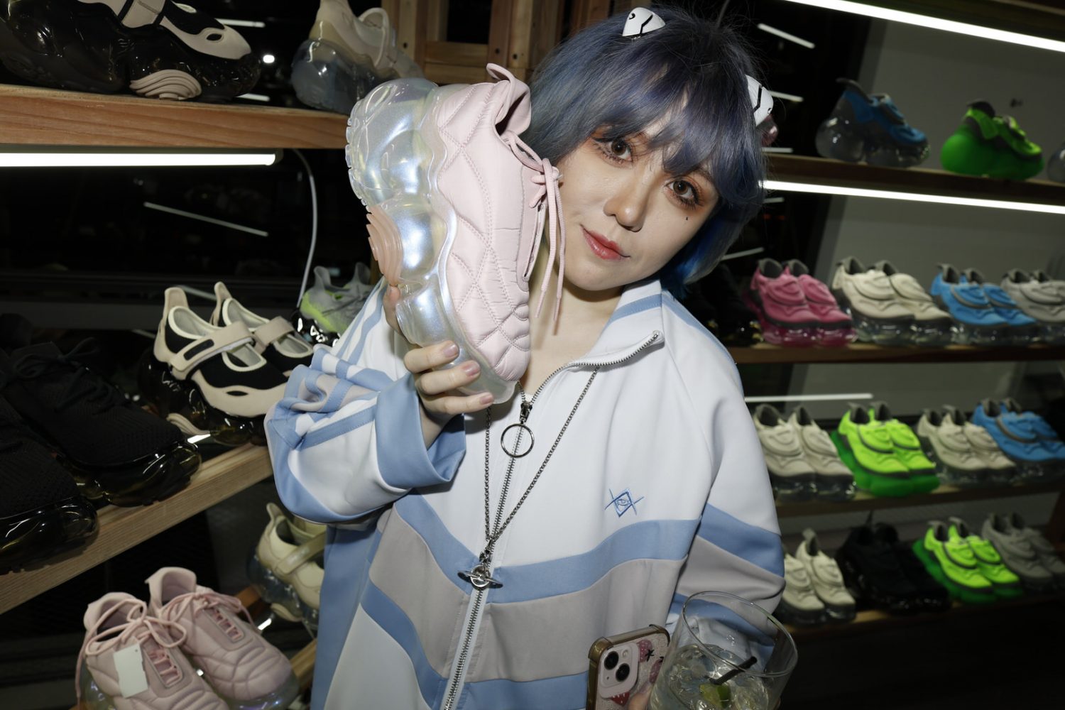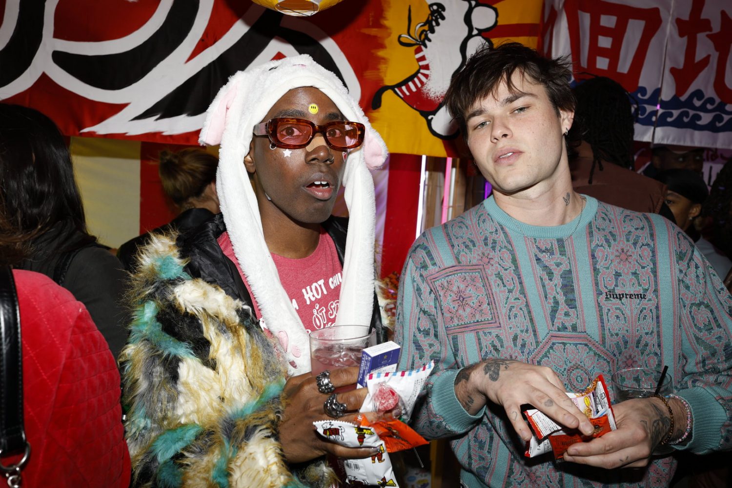 The installation takes over the prime basement level of the H Lorenzo Men’s store, building out a Tokyo street market in the space featuring neon lights and a kaleidoscopic signage. Every table and available surface was healthfully scattered with Japanese candies and treats. For the opening night the store blared with hyperpop provided by ko aka koala while an eclectic array of the night time’s brightest stunted and provided life to the street market backdrop.