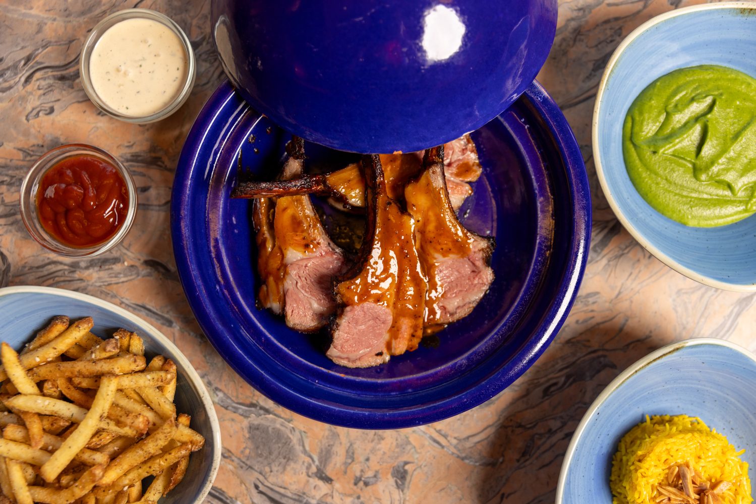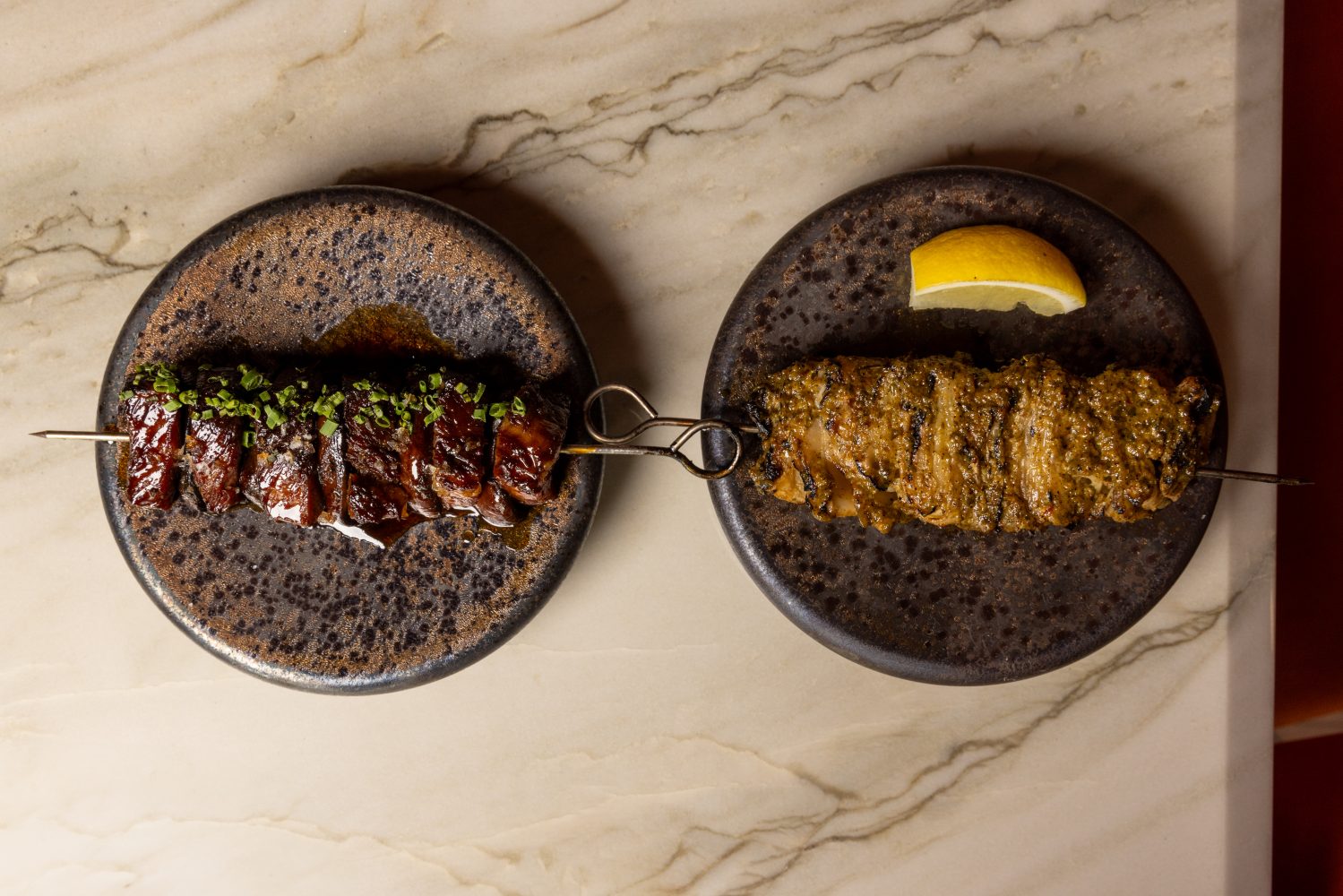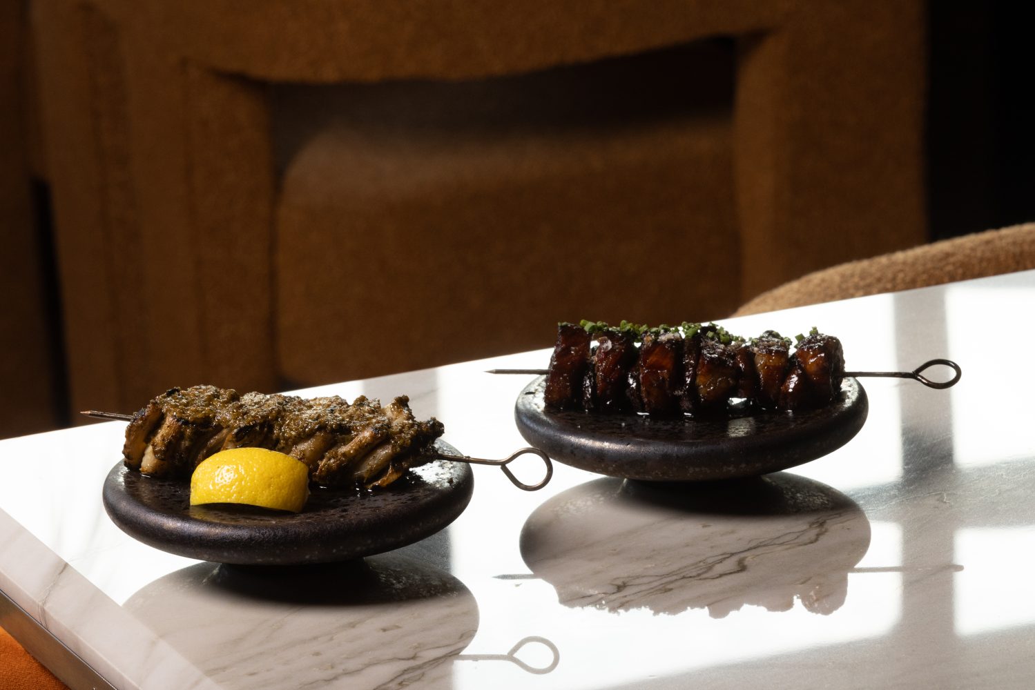 On a relatively quiet corner of Ocean Avenue, tucked inside the Sonder hotel, Santa Monica’s Layla evokes the scents and sights of a souk. The restaurant, named for chef Chris Sayegh’s grandmother— the anchor from which many of these recipes draw inspiration— centers Jordanian fare on their extensive (yet concise) menu. The Jordanian roots in Sayegh’s dish allow for a complex melding of varied cultures and a globally influenced cuisine, much like the populace of the country itself. Though, don’t dare refer to the menu as fusion— Sayegh’s creation is uniquely, devoutly Jordanian. Dishes are deeply rooted in tradition, true to the style of Sayegh’s jiddeh (Arabic for grandmother), and nuanced by the head chef’s own gastronomic exploration (think: an aerated hummus featured in the shareable mezze, capturing a lightness that renders its weight hardly perceptible on the pita, while packing a flavor-punch to the palate that is unmistakably the rich, creamy dip— and the best you’ve ever had at that). Dishes are served family-style, prepared using French techniques meticulously honed through Sayegh’s fine dining education. The Wagyu and mushroom kebabs nod to the Middle Eastern staple with a (beef) cheeky wink to the gourmet.