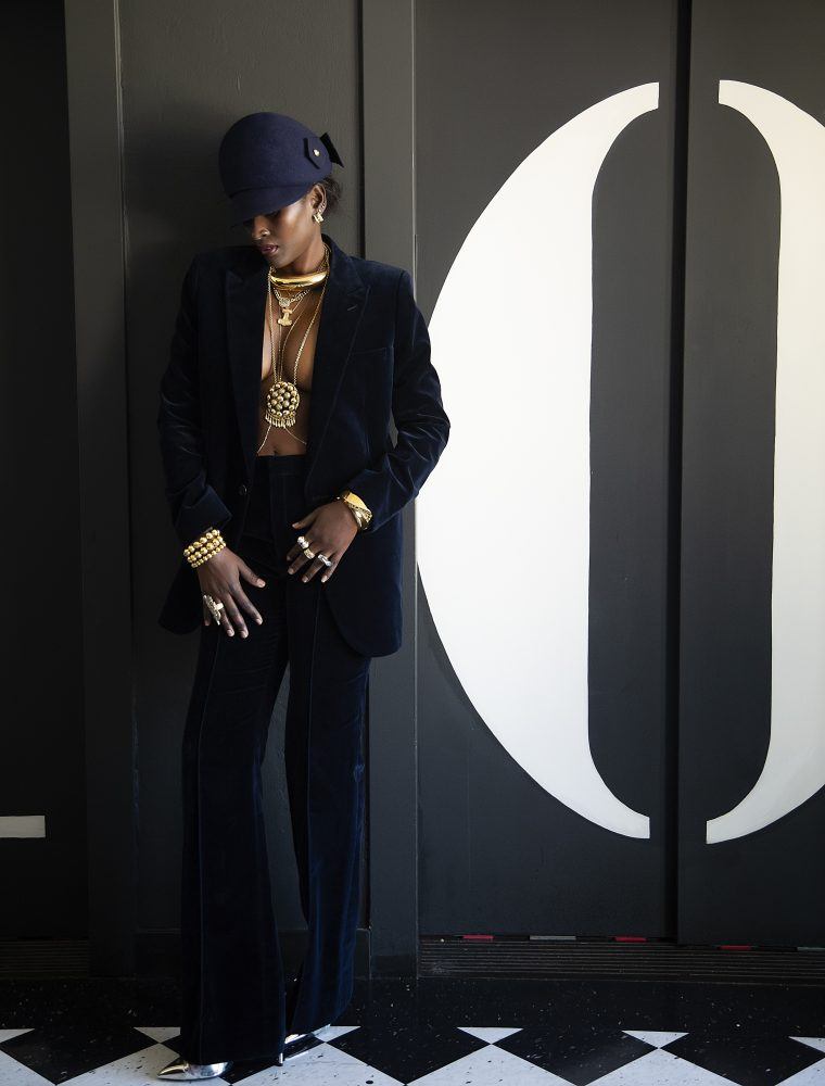 Left: Suit by Saint Laurent. Shoes by Louis Vuitton. Hat by Atmosphere. Necklace: Khadija Neumann, Louis Vuitton, Alexander McQueen, and Saint Laurent. Earrings and rings by Khadija Neumann. Bracelets by Lisilerch, Alexander McQueen. Right: Suit by Tom Ford. Jewelry same through out.