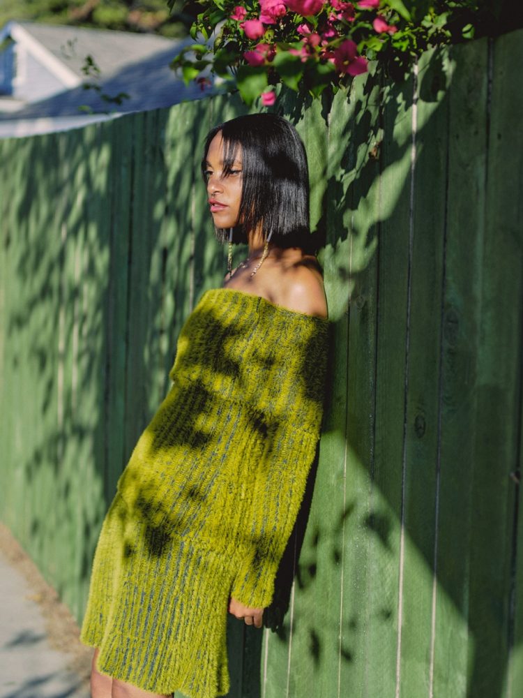 Lucaa wear sweater dress by Yueqi Qi and Jennifer Younger jewelry