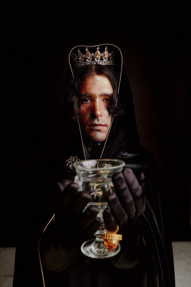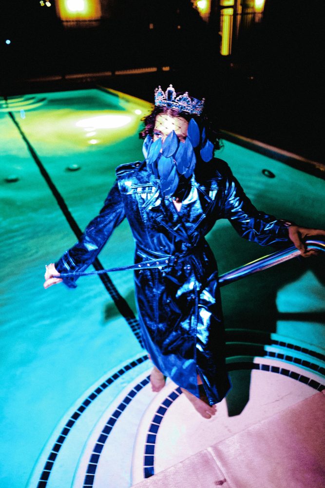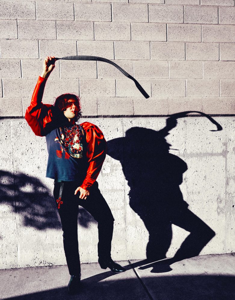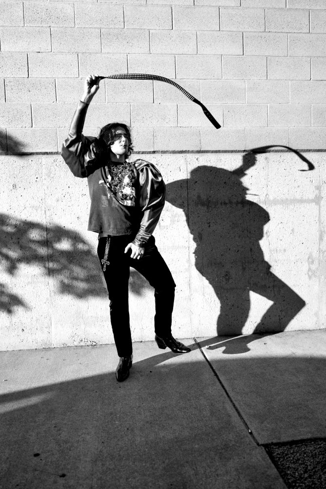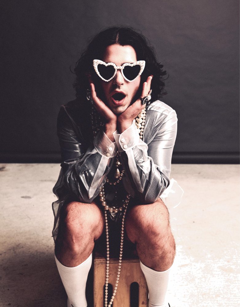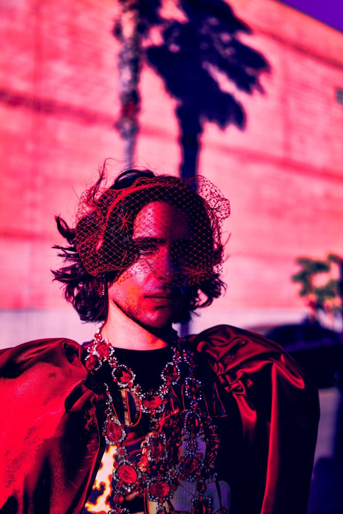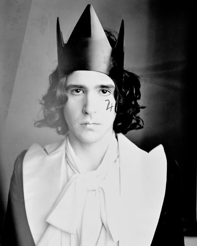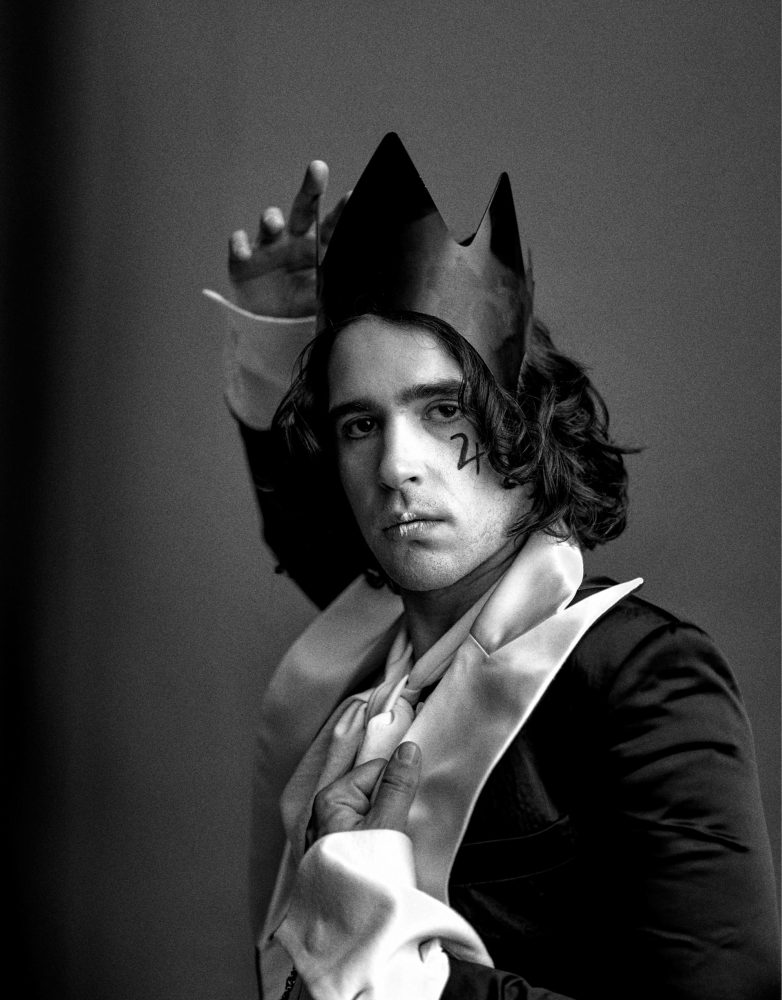 - Nick Grigolia wears Willy Chavarria Tuxedo top and tie. Crown available at Paume Los Angeles