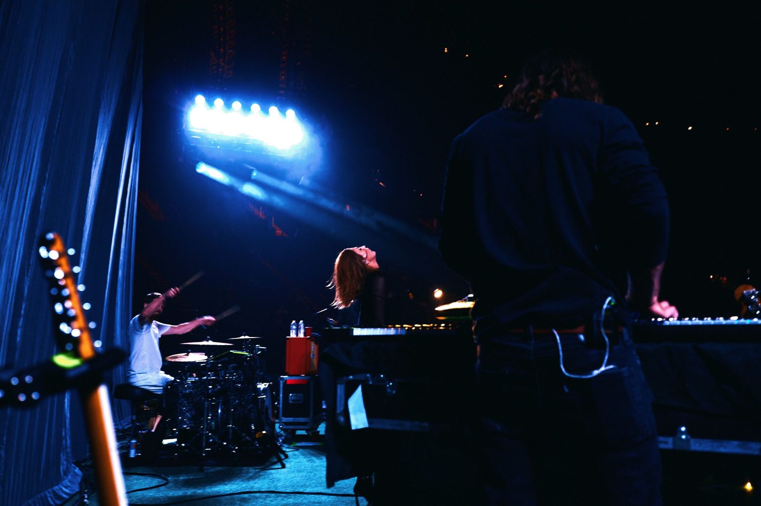 Lights out. A roar. A singly-lit stage. Thunderous stomps of ravenous listeners. Technicolor, to mimic the kaleidoscopic chords. On Thursday, Sarah Barthel and Josh Carter— the 14-year coupling comprising Phantogram— electrified the Kia Forum with symphonies of synth, playing predecessor on Kings of Leon’s national tour, spanning dozens of cities across the country. Each of the stadium’s 17,000 seats echoed with the rhythms of the band’s greatest hits and latest releases, the most recent of which includes “Come Alive”: a fresh single paying homage to the duo’s spectral sound and alternative lyricism. The band is set to headline numerous shows in the coming months, as they edge toward the release of Memory of a Day, their fifth full-length studio album, marking an impactful return to the industry with the first unveiling of a new sound since 2020’s Ceremony. Memory of a Day stands as a significant milestone in the duo’s next chapter, as it is their freshman creation in partnership with Neon Gold Records, lauded indie label which kneaded the talents of Charli XCX and HAIM. Poignantly, “Come Alive” embraces and emphasizes existence’s ephemerality, reflecting on troughs and triumphs as one would a calendar. It is no accident that this record is borne of such a fruitful pairing, sending Phantogram into orbit, reclaiming their post on the global stage. Anticipation of Phantogram’s renaissance permeates the Forum, the hypnotic beat entrancing veteran and newborn fans alike, seducing thousands into the fold of the experimental, the transcendently psychedelic. Barthel and Carter weave onstage chemistry of decades-old collaborators, cultivating creation as they carouse, at once maudlin and merry, seriously stirring. The nature of Phantogram’s blended tempos and incomparable conspiracy renders each performance rare and remarkable, coaxing attendees to witness as many playings as possible, heartily reinvigorating the notion of groupies of yore.