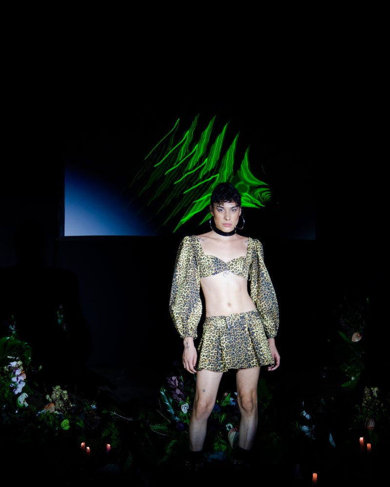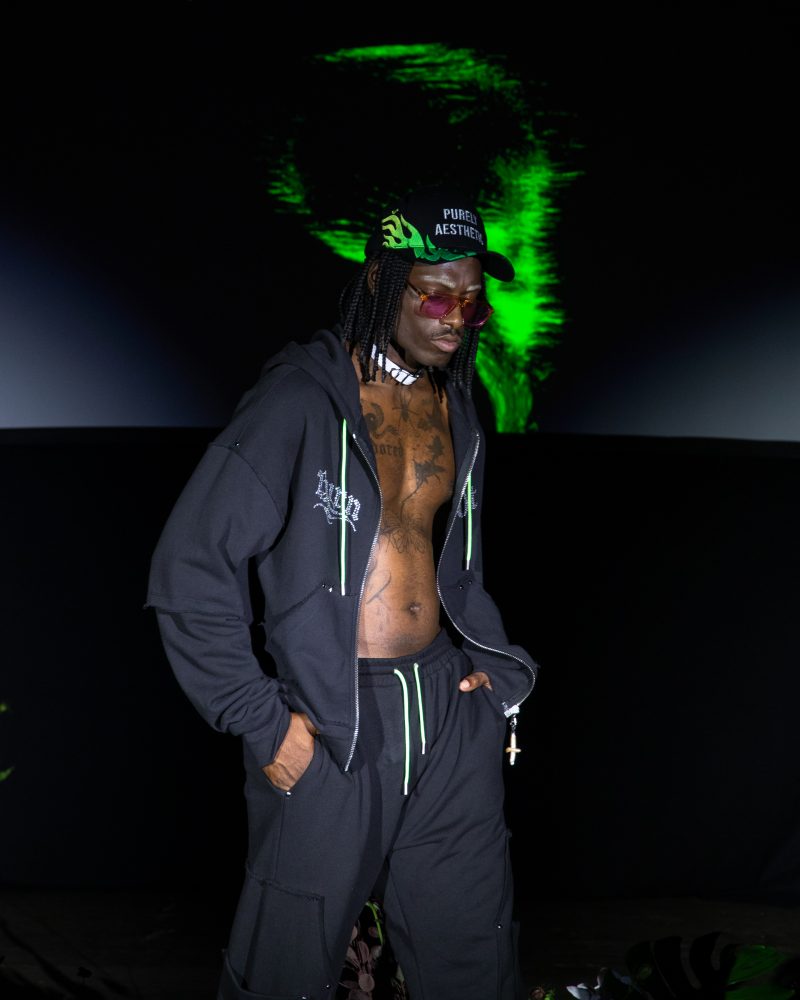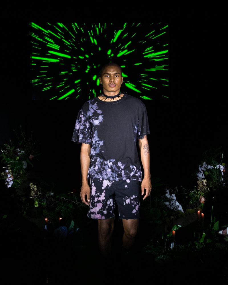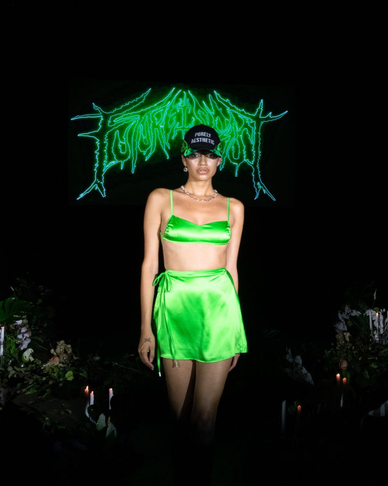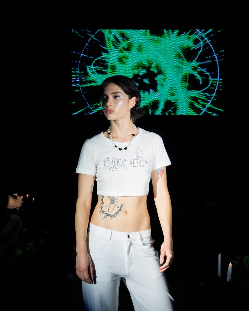 Reserved friend Nats Getty presented his first runway show for Strike Oil which focused on unisex acidic rave details spanning from leopard print 2 pieces, Mountain Dew green piping on overlock bodices and a bountiful spray of bleach treated tie dyes. The latest addition to the wardrobe came with the naughtiest details of Swarovski pixel wording at the most dense.