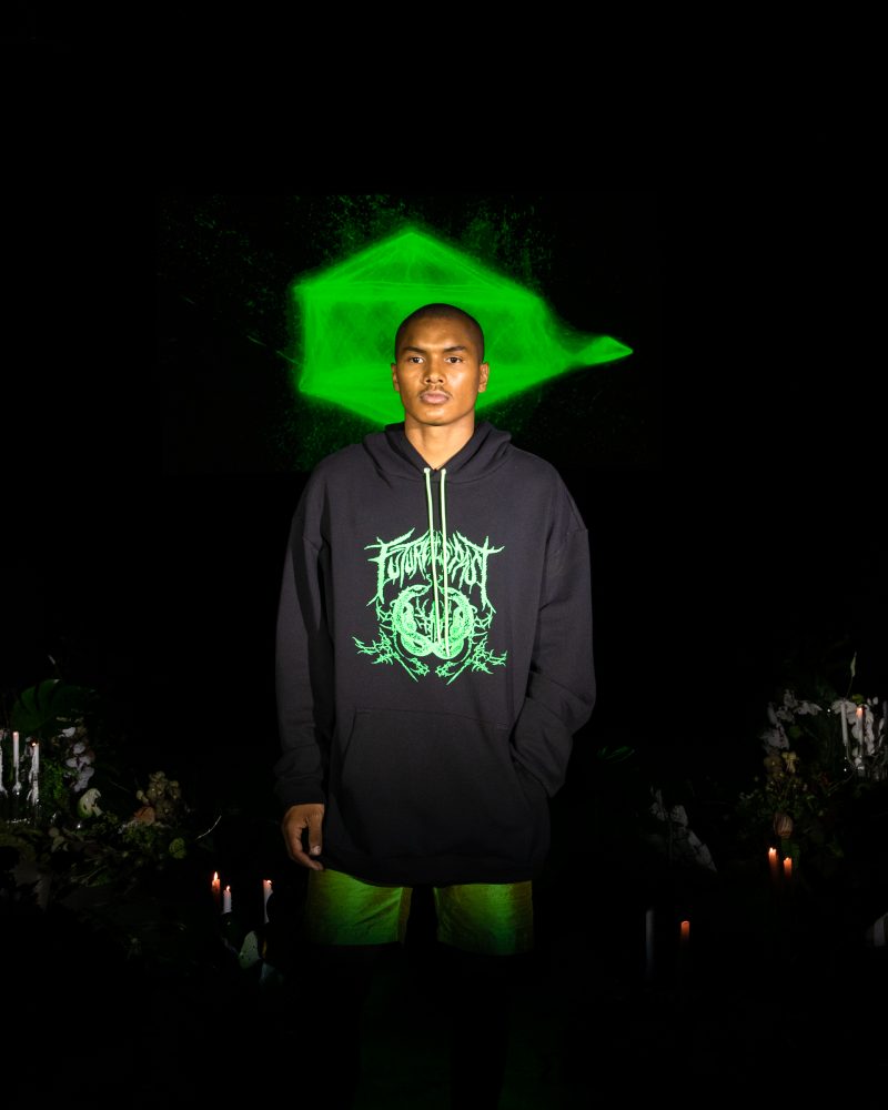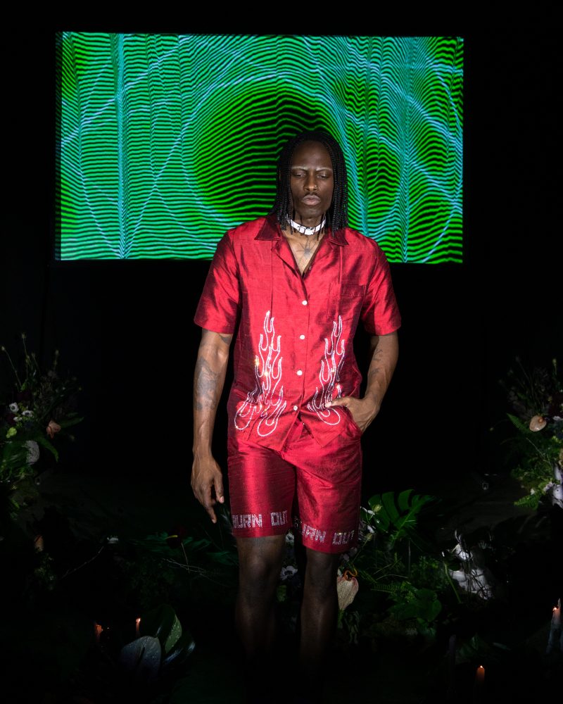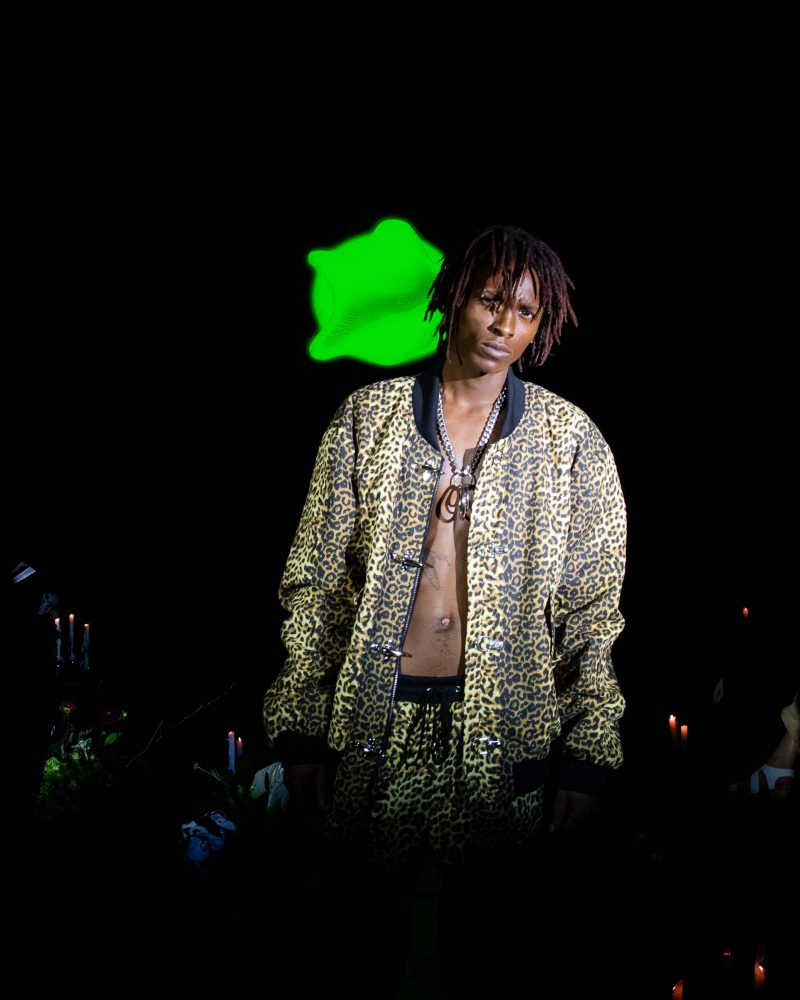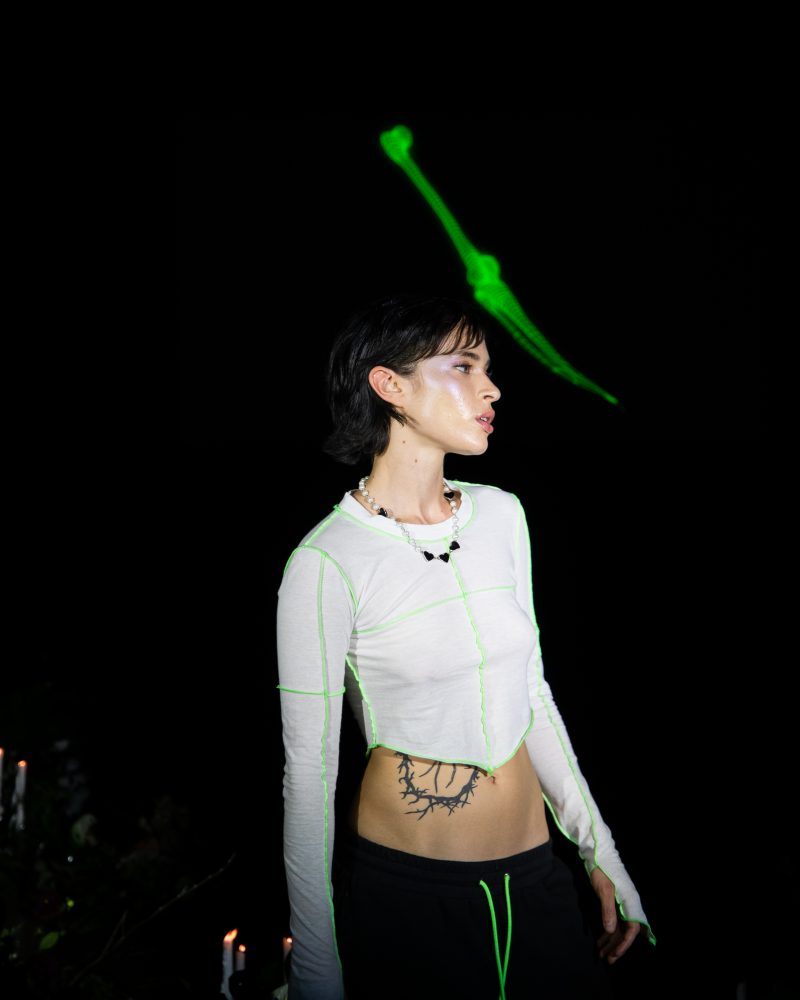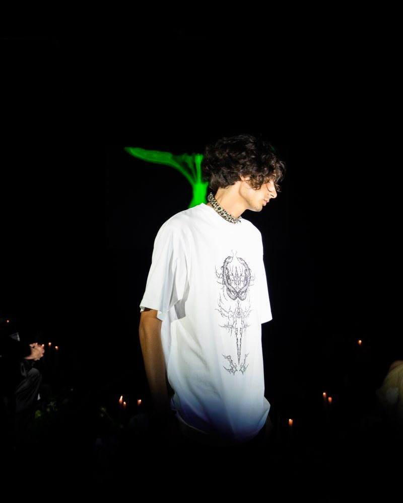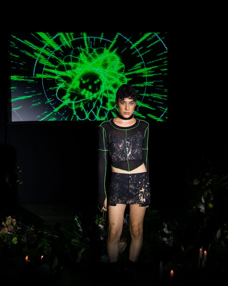 Reserved friend Nats Getty presented his first runway show for Strike Oil which focused on unisex acidic rave details spanning from leopard print 2 pieces, Mountain Dew green piping on overlock bodices and a bountiful spray of bleach treated tie dyes. The latest addition to the wardrobe came with the naughtiest details of Swarovski pixel wording at the most dense.