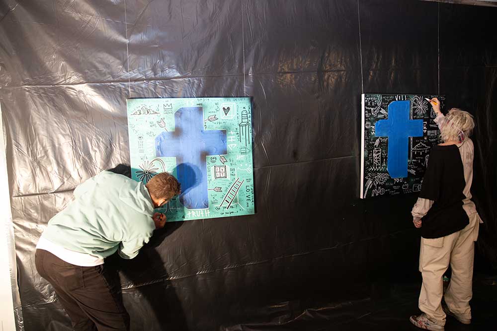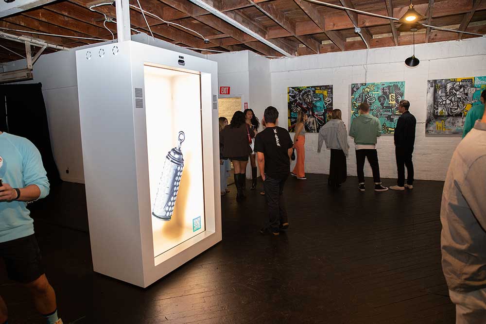 At the opening event, Bourn Rich featured a documentary that highlighted connection and community in a work showcasing his graphic language while engaging with the various people walking through Melrose Ave. A display of his computerized necklaces were blown into lifesize proportions floating in a 3D box that also inter-grated AR tech in the form of an Instagram filter triggered through QR tech. The drinks poured cold as the open art space’s covid friendly opened and exposed windows also help to lol the classic scent of spray paints as they lingered with various engulfing smoke and the dewy hint of the evening’s east side mist.