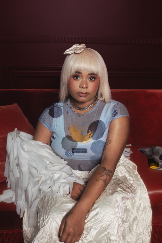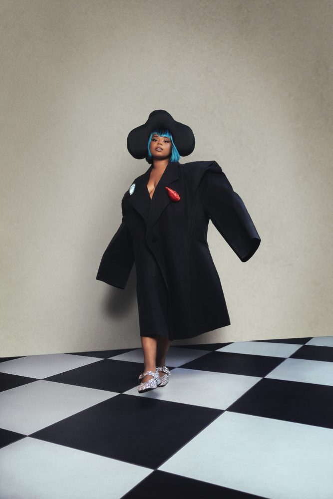 - Tayla Parx wears ISSEY MIYAKE coat, KENTARO KAMEYAMA headpiece, YIE YIE shoes, and HOTHEAD teardrops.