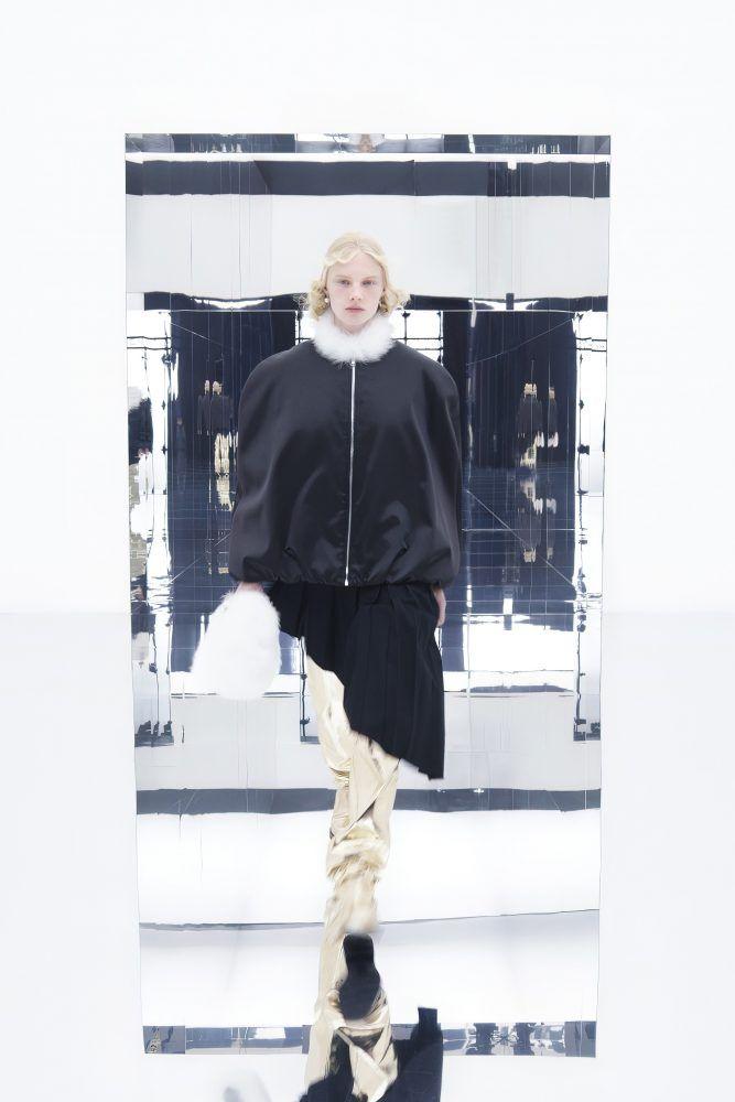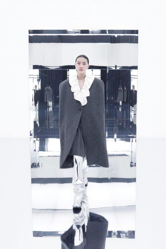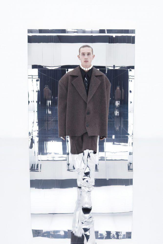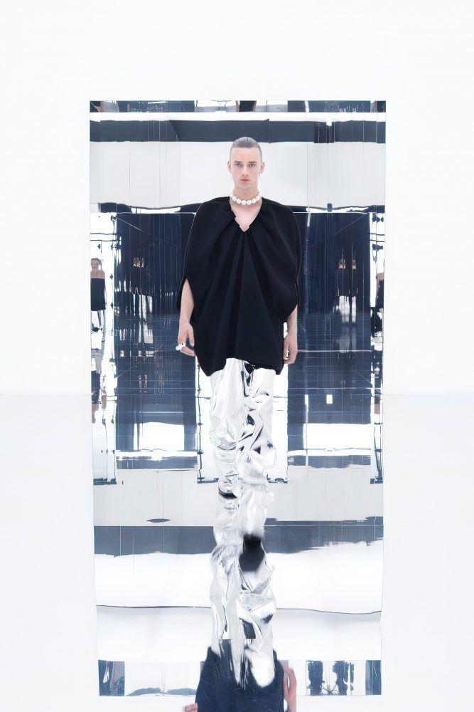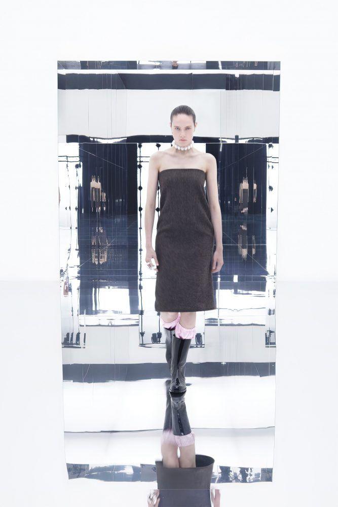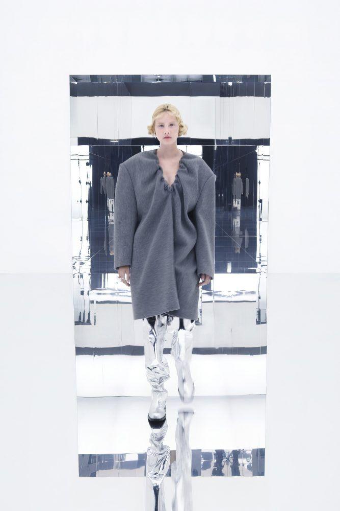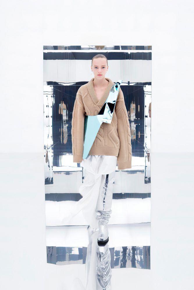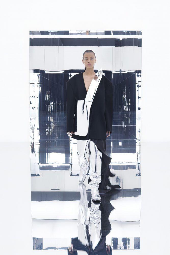 It’s hard to pick out a favorite from the selection of the Korean based brand We11done. Mirrored Metallic Mania Matched with Matte flannels has come to excite to the point of alliteration. The contrasting textures do not come off abrasive or jarring but rather complementary. Sharp minimalist tailoring in oversized shapes is soften by an array of simple pearl jewelry and delicate draping which references renaissance garment constructions. The punctuations of the heavy metallic boots will be a great item to see worn in the fall by the art set from the gallery opening, to the dinner to the afterparty.